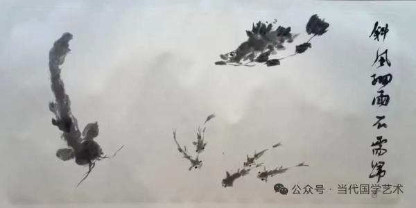 比如,他那一幅题字“斜风细雨不需归”的图中,几只鱼儿,正游着,朝向不同方向,不见一滴水,也没有一朵浪花。但鱼身凸凹,点点块块,正是好花儿,风中起舞,圆月天。小小的鱼宝宝们,身子断断续续,浓浓浅浅,黑黑白白,如水草,如仙草,伴着墨花开。