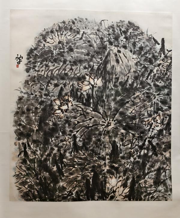 至轻需至重帮衬,疏散当以浓密呼应,这样,在造型上才有精微而广大之境界。衲子的画作,散淡清和的气象比较容易看出来,但厚重浓郁之气,容易被忽略。记得在前年看过他的一幅墨荷,长长的横幅,一看,我就立即想起了鲁迅的名句:“万家墨面没蒿莱,敢有歌吟动地哀。”无数荷叶,在浩荡的宇宙中,唱着墨色的哀歌。