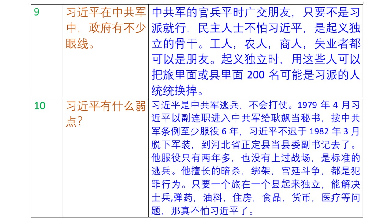 中共军起义独立探讨九:替换军中,政府中习近平人员。中共军各军各旅肯定有习近平安插的人员,地方也是一样。比如在起义独立旅长眼里,一个旅里面200人面目不清,那让这200人全部离开部队,由地方上的工人,失业人等补充。一个县也是同样办理。所以每位起义独立人员平时一定要收集人员信息,到时候用的着。