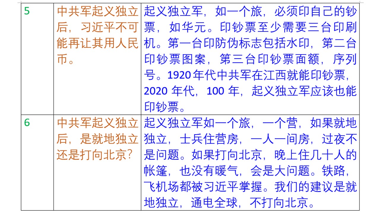 中共军起义独立探讨六:起义军是就地独立,还是打向北京?一个县独立了,也要通电全球,说清楚,习近平不派兵来打起义独立军,起义独立军也不打北京,就呆在原地。如果习近平派兵来打起义军,那起义军如果在本县打败了习家军,就可能打向北京。我们民主人士的建议是就地独立,在一个县,或几个县,如陕南,皖北独立,而不是打向北京。我是在军队工作过几年了,在美军第一步兵师工作了三年。部队到另一个地方去有士兵住宿,油料,交通等大问题。起义独立后,士兵在营房里有单间住,到另一个地方住大帐篷,就是几十人一个房间了,帐篷有没有暖气,难啊。铁路,机场都掌握在习近平手里,火车司机,民航飞行员按体制不能运送起义军。这里涉及我们谈的下一个问题,12亿民众如何参与起义独立或帮助中共军起义独立?