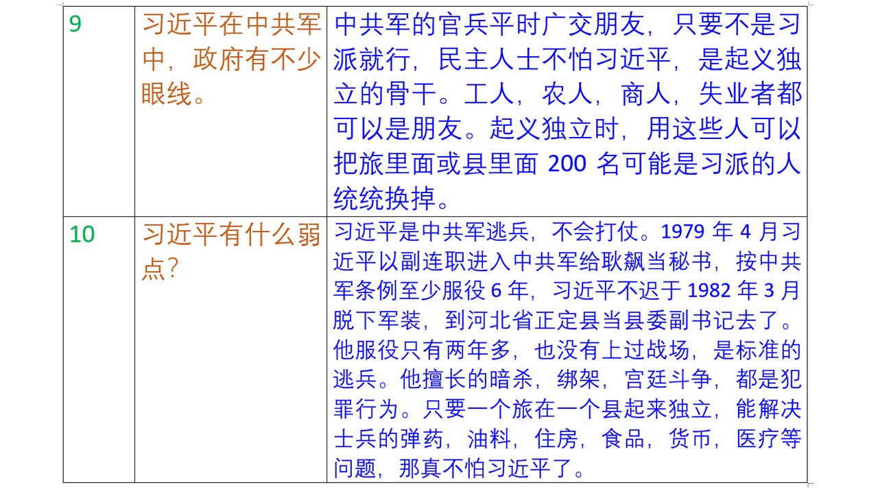中共军起义独立探讨九:替换军中,政府中习近平人员。中共军各军各旅肯定有习近平安插的人员,地方也是一样。比如在起义独立旅长眼里,一个旅里面200人面目不清,那让这200人全部离开部队,由地方上的工人,失业人等补充。一个县也是同样办理。所以每位起义独立人员平时一定要收集人员信息,到时候用的着。
