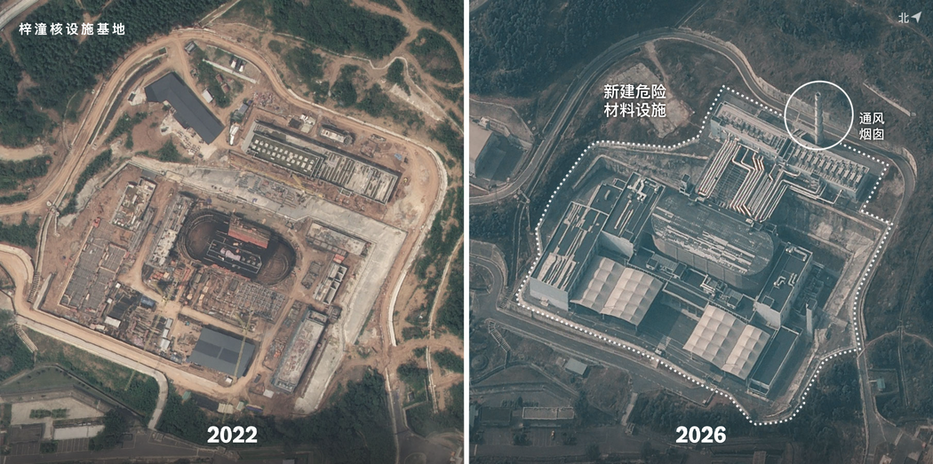 在一个叫平通的地方,山谷中还有一座被双层围栏包围的设施。专家认为,中国可能在那里制造装填钚的核弹头核心。该设施的主体建筑以一座约110米的通风烟囱为标志,近年来这里进行了翻修,加装了新的通风口和散热装置。旁边还有新的建筑工程正在进行。