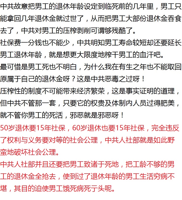 男性平均寿命72至74岁,女性平均寿命79至81岁,中共利用人均寿命78岁来计算退休年限就是找男人吃亏的。还有在社保缴费一刀切的情形下,退休年龄却大搞男女歧视,更是找男人吃大亏充当冤大头的恶毒行为!对此也是中共所吹嘘男女平等是我国的基本国策的极大讽刺!只有强迫交社保的政策而没有退休金全部返还的承诺,就足已说明中共在抢钱要吃死人财的行为了,再加上社保退休金没有承继权的法律依据,就为中共强抢老百姓钱财提供合法理由了。现在有大量有十年八年的社保缴费或工龄但过了退休年龄而拿不到退休金的男人,他们的存在就是中共抢钱吃死人财的最好证据了