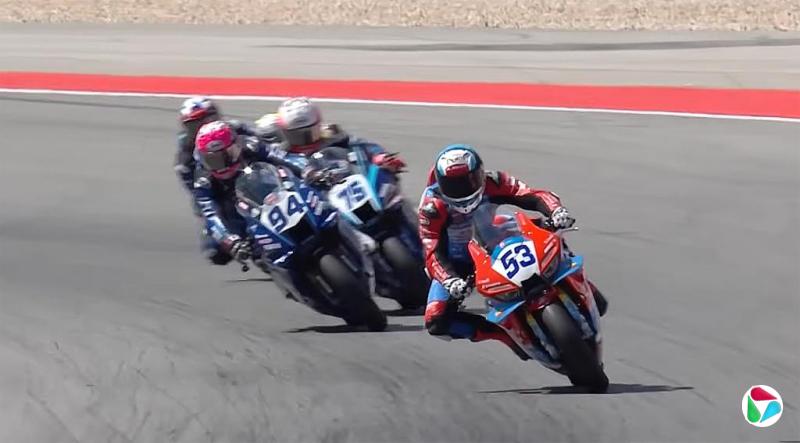 张雪机车在3月29日世界超级摩托车锦标赛葡萄牙站夺冠后,扬名国际。图为比赛当天,车队法国车手瓦伦丁·德比斯(右)在赛道上疾驰。(视频截图)