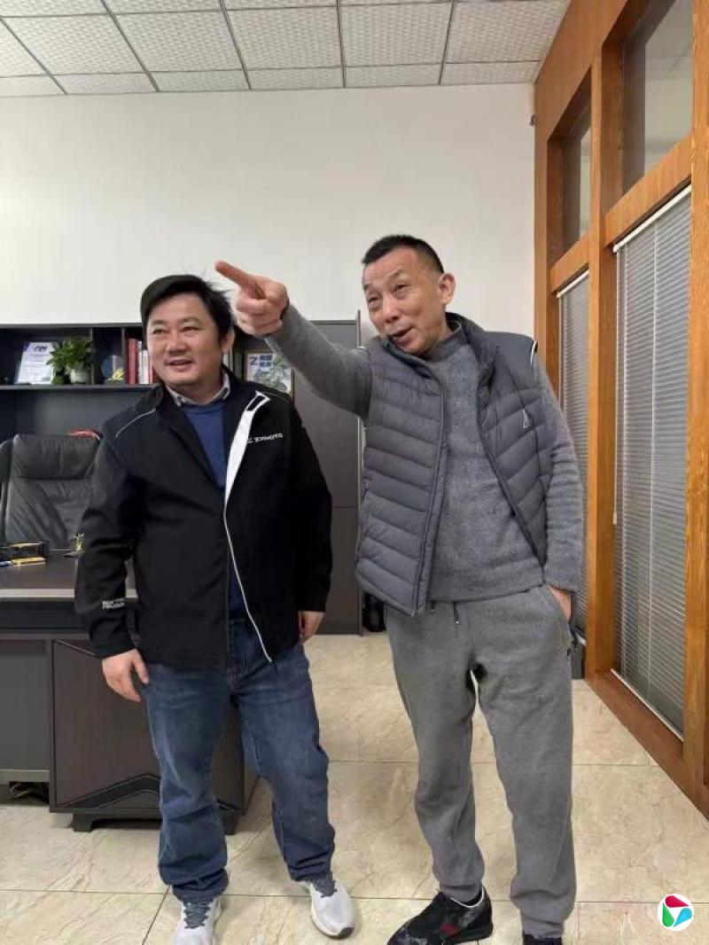 重庆汽车摩托车行业协会副会长李学平(右)今年3月20日带队走访重庆张雪机车工业有限公司。图为李学平在张雪(左)办公室与其合影。(受访者提供)