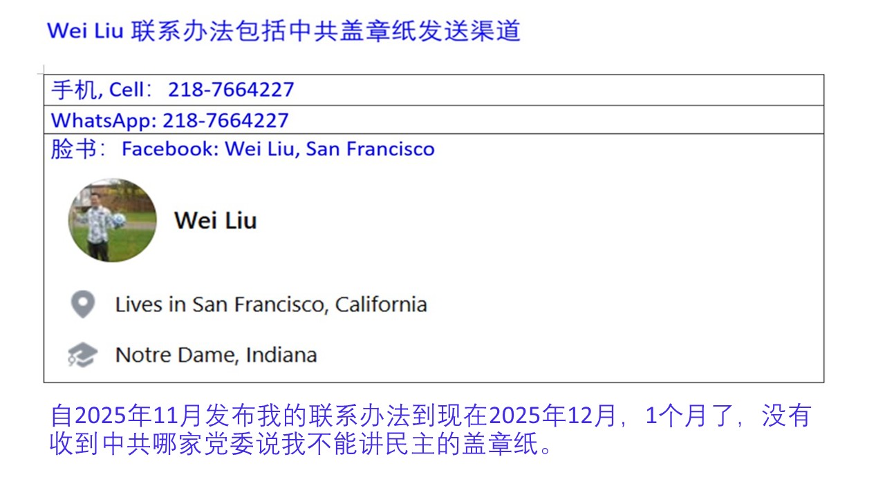I have three channels to receive information of the world. My cell phone: 01-2187664227, WhatsApp: 01-2187664227, Facebook: Wei Liu, San Francisco, man with a soccer ball. After I post my contact in November, 2025, till now December 2025, one month passed, there is no stamped paper from Chinese Communist stating that I cannot talk about democracy.