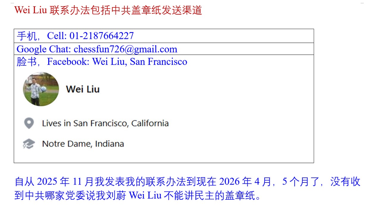 I started talking about democracy in the 2000s. The 2020s is my third decade talking about democracy. There is no Stamped Paper from Chinese Communist saying that I cannot talk about democracy. I have three channels to receive information of the world. My cell phone: 01-2187664227, Google Chat: chessfun726@gmail.com, Facebook: Wei Liu, San Francisco, man with a soccer ball. After I published my contact in November, 2025, till now April 2026, 5 months passed, there is no stamped paper from Chinese Communist stating that I cannot talk about democracy. This is also my contact to make friends.