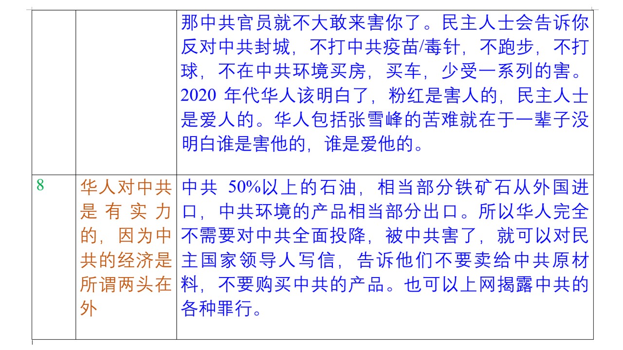 Learning 8 from the death of Xuefeng Zhang: Facing the oppression of Communist, Chinese people are not powerless because the material and market of Communist China rely on Democratic Countries. For example, most of oil of China is imported, its iron ore is imported from Australia, and its market is relied on America and Europe. If Chinese people write to leaders of democratic countries not to do business with China, economy of China can be affected.