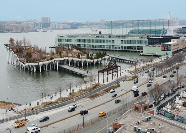 Overview of Little Island & Pier 57 from the Whitney Museum, the End of High Line Park