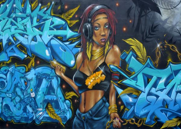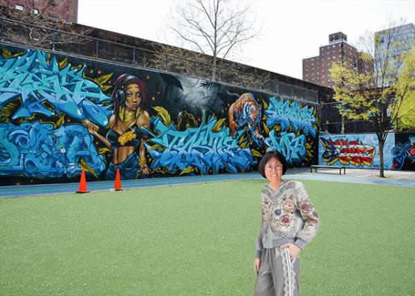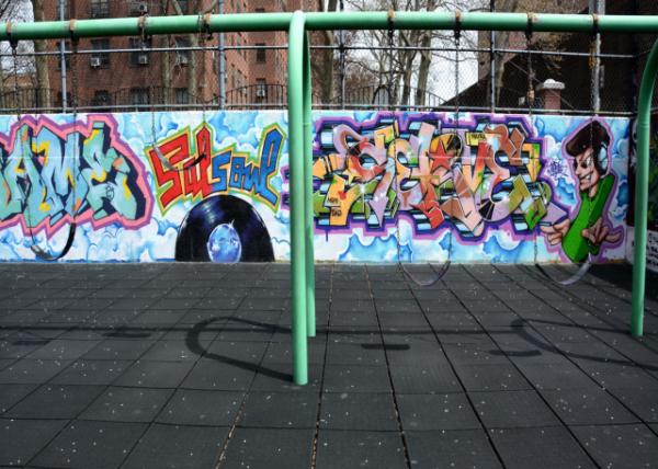 【注】涂鸦名人堂位于纽约东哈莱姆“沙脊家园”区106街和公园大道的传奇校园(Jackie Robinson Educational Complex),由绰号“刺魟”的社区活动家阳光·著名统治者(Ray Rodriguez, aka Sting Ray)于1980年左右创立,旨为街头艺术家提供展现喷漆技艺的户外画廊,如今这些混凝土墙画布已然变成“至高无尚好上加好”(Strictly Kings or Better)的涂鸦名人堂。