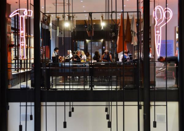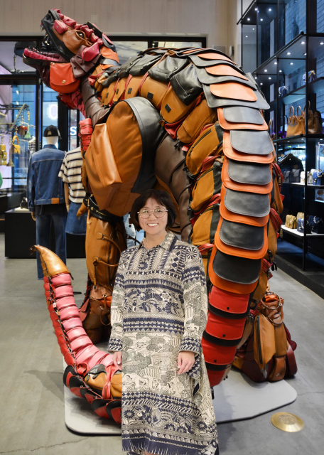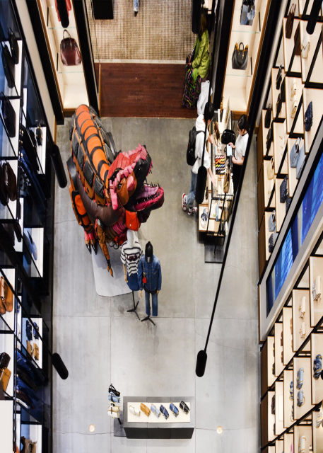 Rexy, a 12-Foot/3.7-Meter Dinosaur Made from Handbags, Dominating the Ground Floor Entrance