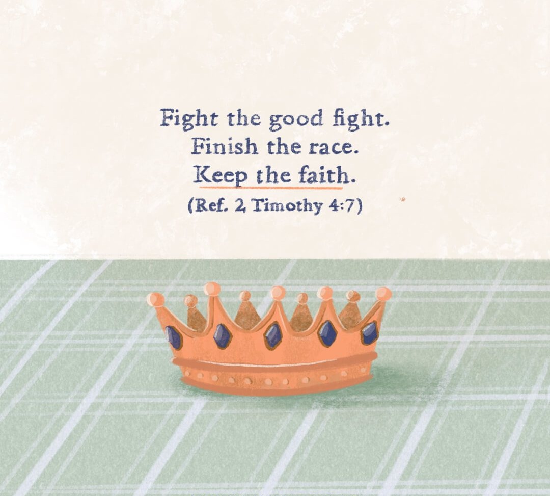 “那美好的仗我已经打过了。当跑的路我已经跑尽了。所信的道我已经守住了。从此以后,有公义的冠冕为我存留,就是按着公义审判的主到了那日要赐给我的。不但赐给我,也赐给凡爱慕祂显现的人。”(提后4:7-8)