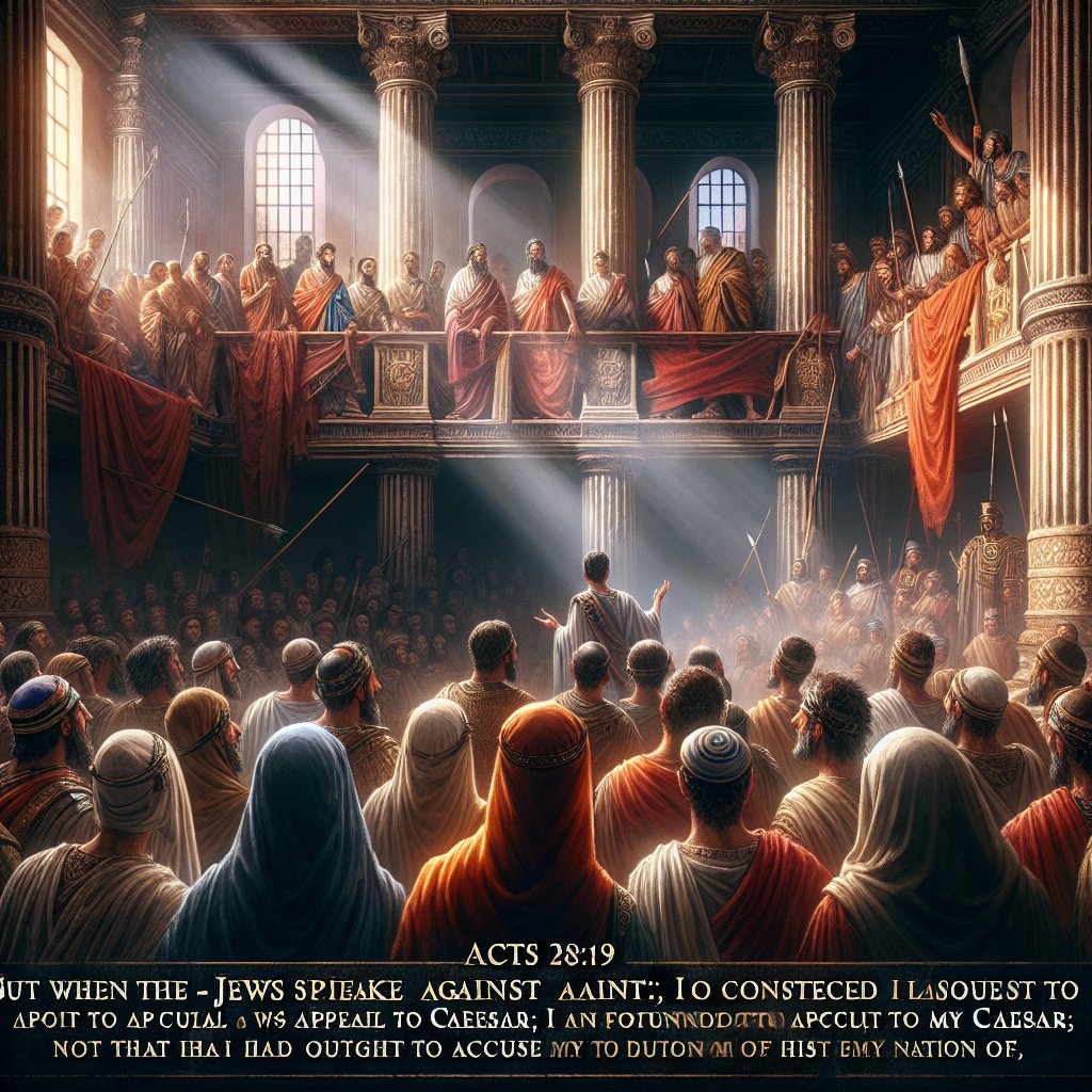 外邦官长本想释放保罗,但犹太人执意施压要给他定罪,保罗无奈才上告于凯撒。保罗向犹太人说明,他之所以从耶路撒冷被解到罗马,并不是要控告自己本国的百姓,他上告凯撒,一是为自己的无罪申诉,但更重要的是,他蒙主的启示,要到罗马为主作见证。保罗从来都无暇顾及自己的荣辱得失。