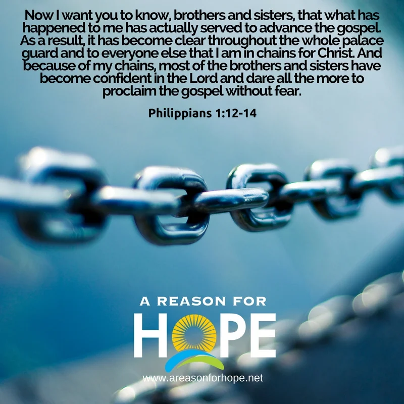 “弟兄们,我愿意你们知道,我所遭遇的事,更是叫福音兴旺。以致我受的捆锁,在御营全军和其余的人中,已经显明是为基督的缘故。”(腓1:12-13)