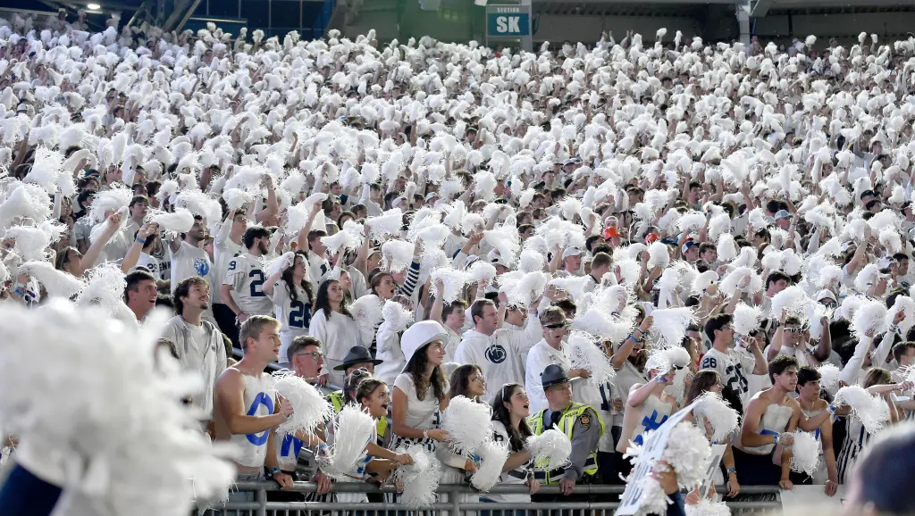 9月27晚上对阵俄勒冈州的美式足球比赛中,许多宾夕法尼亚州立大学球迷穿着查理·柯克的“自由”T 恤。