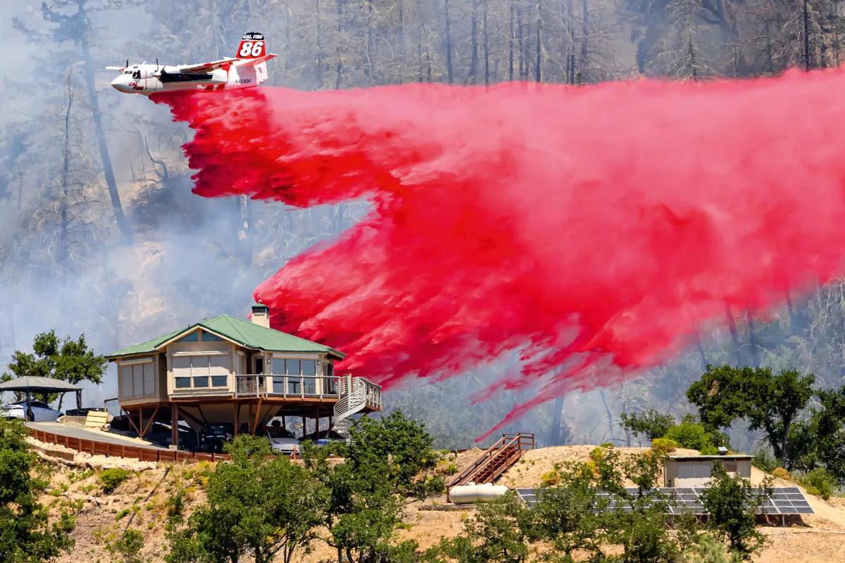 2024年加州山火期间,一架空中灭火飞机向一栋房屋投放阻燃剂——图片来源:Getty Images