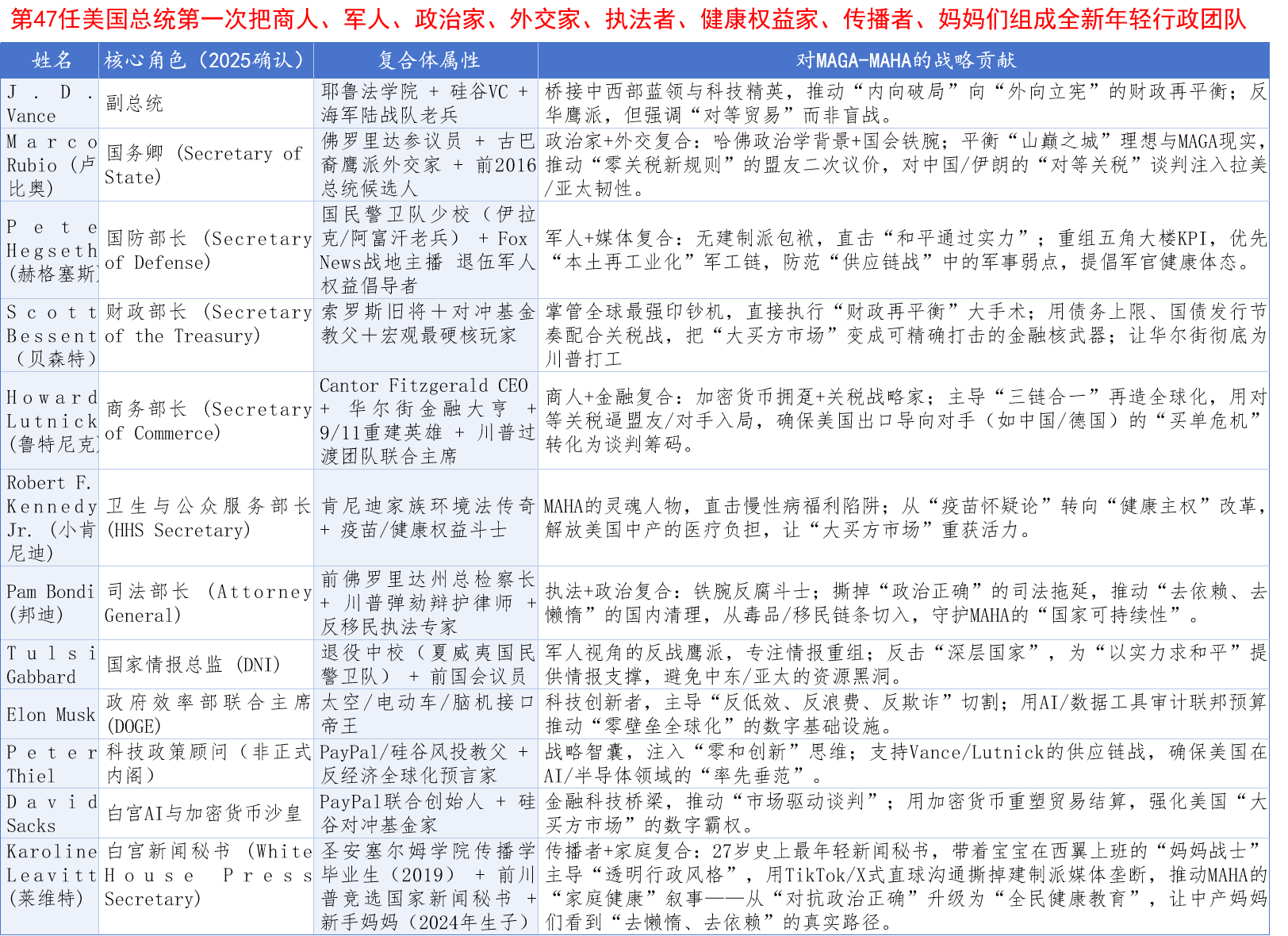 这个团队:不是谁的履历多牛,而是他们的“交互创新”——商人教KPI,军人带纪律,政治家定方向,外交家开路,执法者收尾。47时期的外生压力(全球裂缝)正通过这套内生引擎,反哺美国重生。