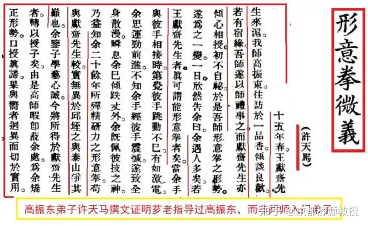 目前为止,只有许天马一个人主张高振东曾师从王芗斋。他声称:“十五年春,王献斋先生来沪,我师高振东,往访于一品香,倾谈良欢,如有宿缘,吾师遂以师礼事之;而献斋先生亦倾心相授,初不自秘,于是吾师形意拳之形势,遂为之一变。”