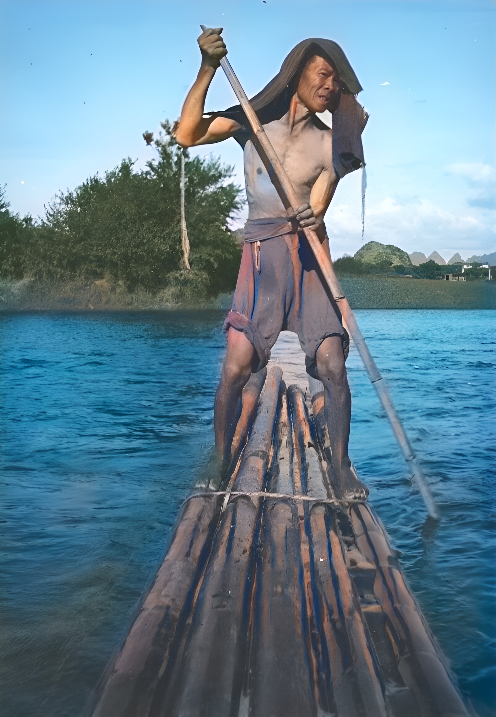 一位老百姓正在撑着竹筏