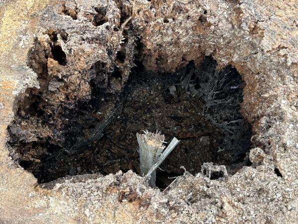 两棵大树被锯倒了。春夏秋季都看到这二位,就在里程牌5的边上,一东一西,隔路相望。它们半空耸立,绿叶如巨伞,煞是伟岸。谁料到里面烂出个大洞。