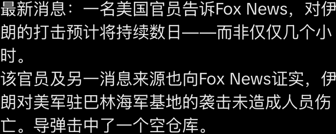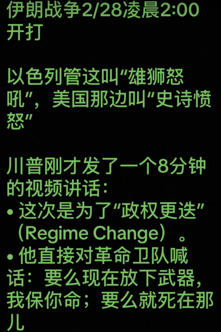 最后,对伟大而自豪的伊朗人民,我要说:今夜,你们的自由时刻到了。保持隐蔽。不要离开家。外面非常危险。炸弹将落遍各地。当我们完成任务后,接管你们的政府。它将属于你们。这可能是你们几代人以来唯一的机会。多年来,你们一直请求美国的帮助,但从未得到过。没有哪位总统愿意像我今夜愿意做的那样。现在,你们有了一位愿意给予你们想要的一切的总统。那么,让我们看看你们如何回应。美国正以压倒性的实力和毁灭性的武力支持你们。现在正是掌控命运、开启触手可及的繁荣辉煌未来的时刻。这是采取行动的时刻,切勿错失良机。愿上帝保佑美国武装部队英勇的男女官兵。愿上帝保佑美利坚合众国。愿上帝保佑你们所有人。谢谢。