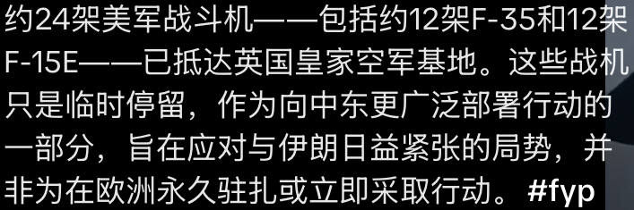 不久前,美国军队在伊朗开始一场重大作战行动。我们的目标是通过消灭来自伊朗政权的迫在眉睫的威胁而保卫美国人民。伊朗政权是一群极其顽固和可怕的人。它的威胁活动直接危及美国、我们的部队、我们的海外基地和我们在世界各地的盟友。