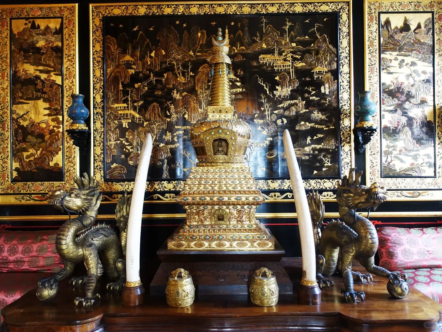 在中国馆中,能看到一尊景泰蓝熏炉完整放置于青铜鎏金佛塔前。