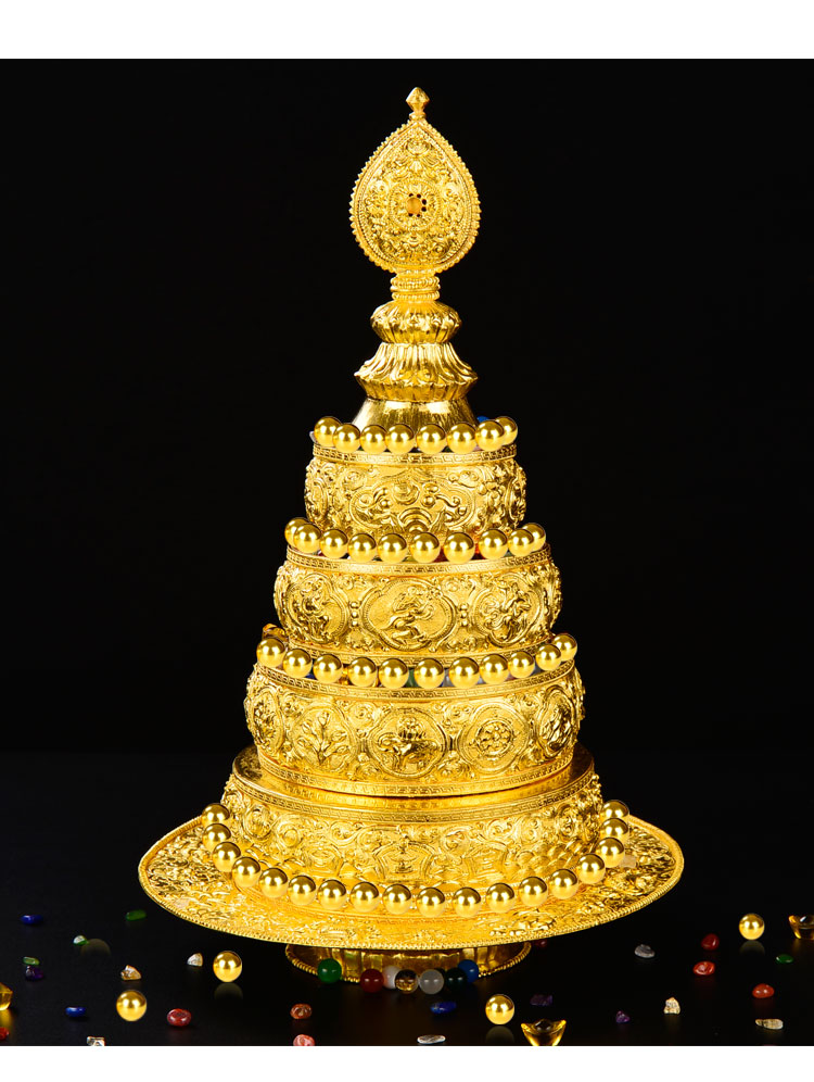 宝塔高约2米,使用200斤黄金打造,工艺精湛,塔身各层镶嵌绿松石、青金石等珍贵宝石。
