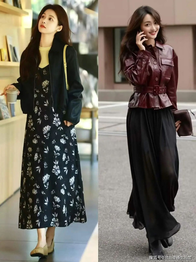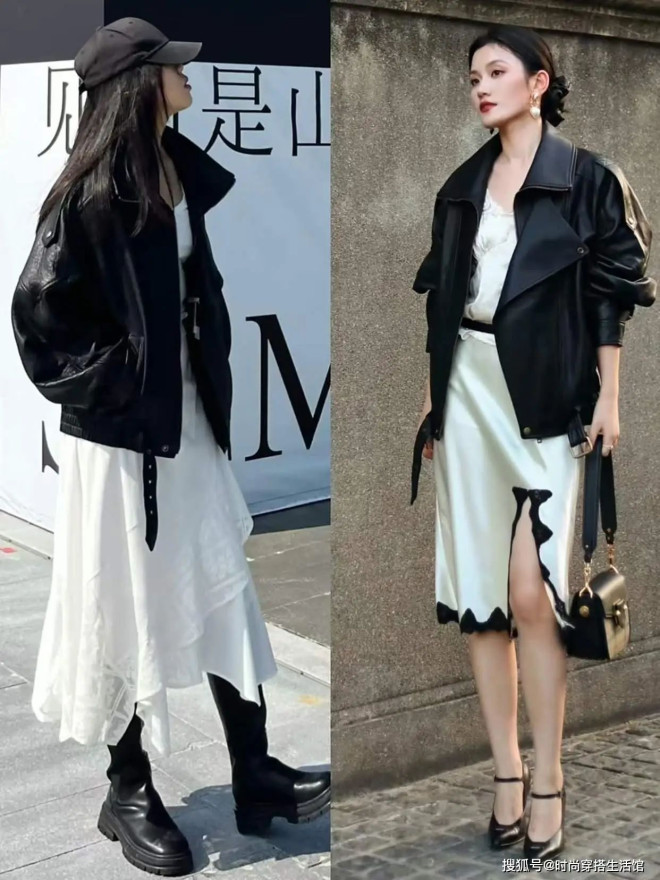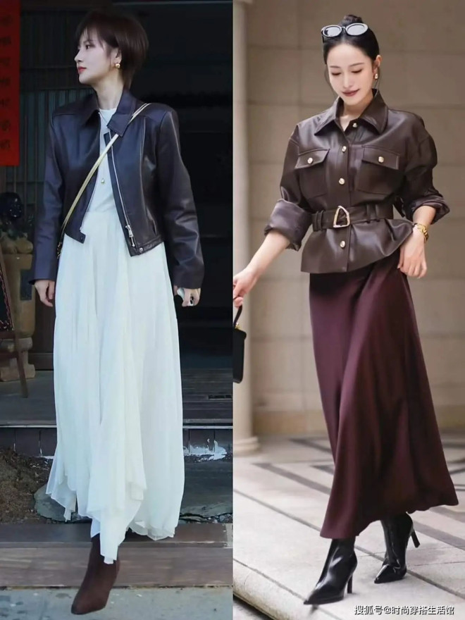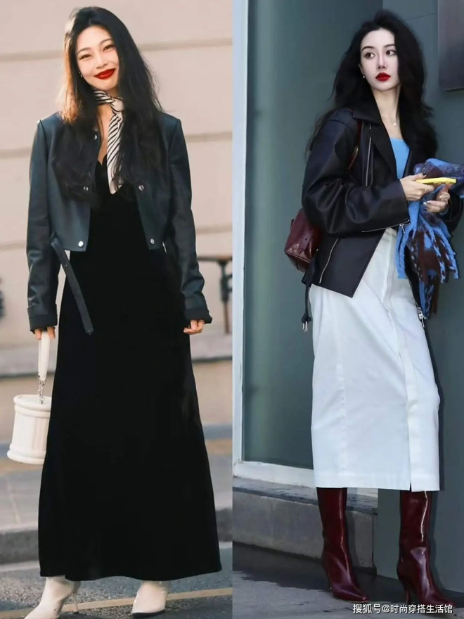 今年秋天火了一种穿法:皮衣+裙子 又美又飒
