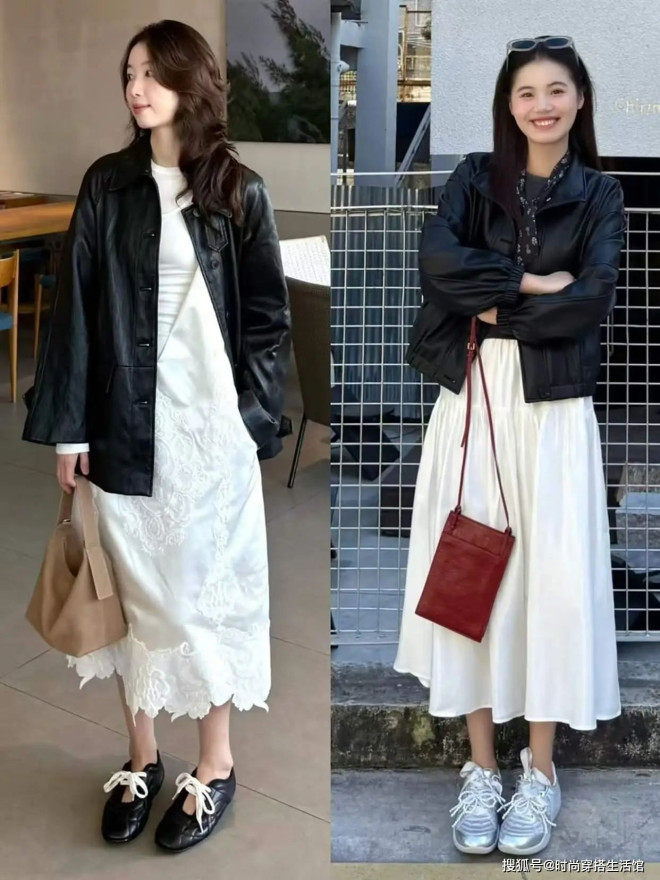 那么为什么说“皮衣+裙子”那么适合秋天呢?主要是因为皮衣的飒爽,裙子的柔美和优雅,将她们组合在一起能够完美塑造出慵懒和松弛的氛围感,不仅能够满足通勤需求,同时还能满足日常逛街等方式,做到了不挑年龄和身材,简直就是谁穿谁美。