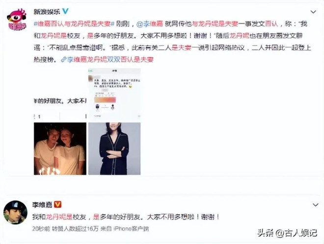 后来李维嘉很快出来澄清,说和龙丹妮只是朋友,没有恋情,想保护对方不被舆论打扰,可大家从他的状态里看出了不对劲。
