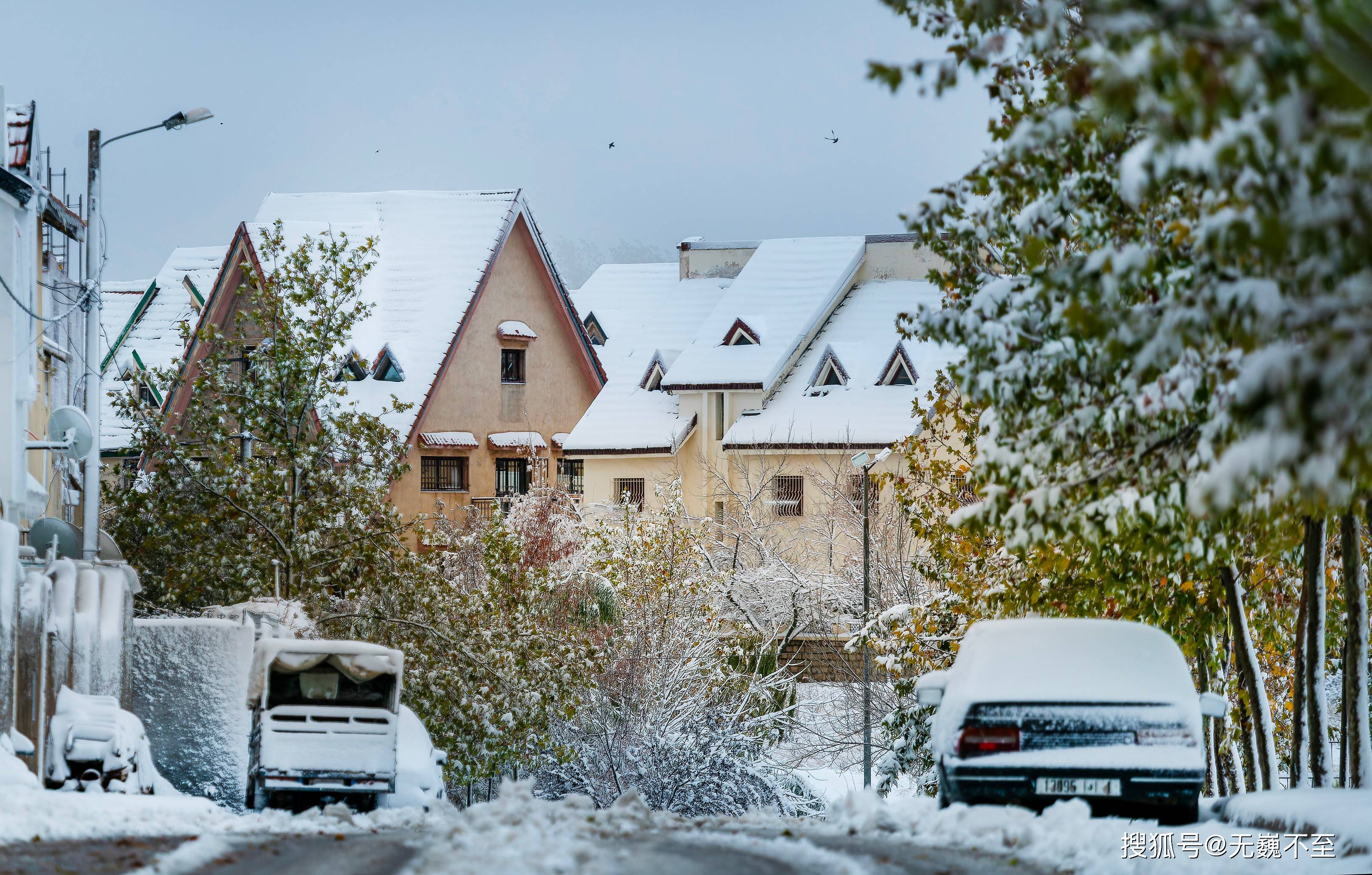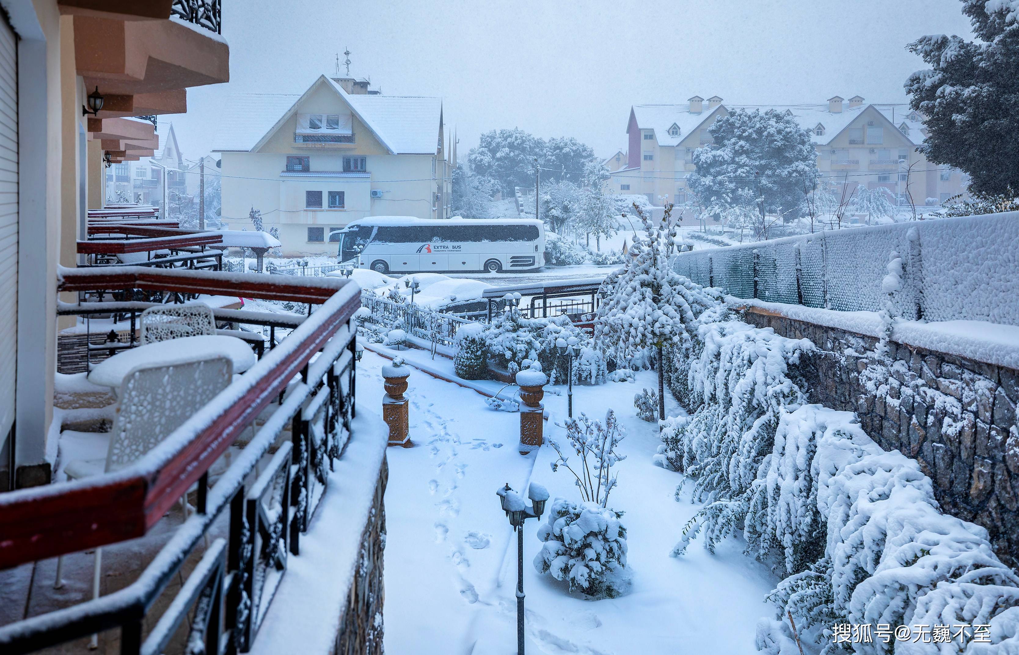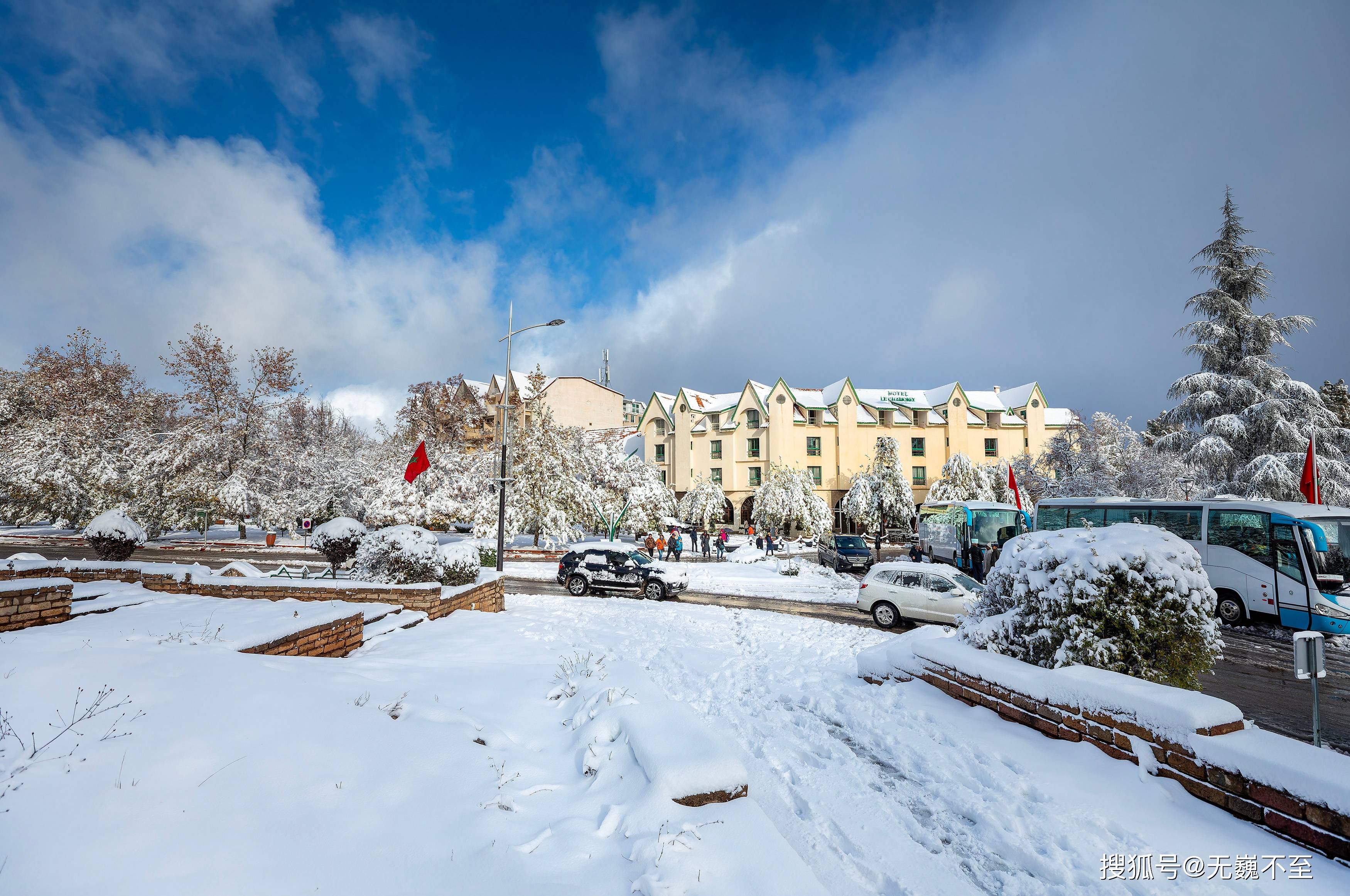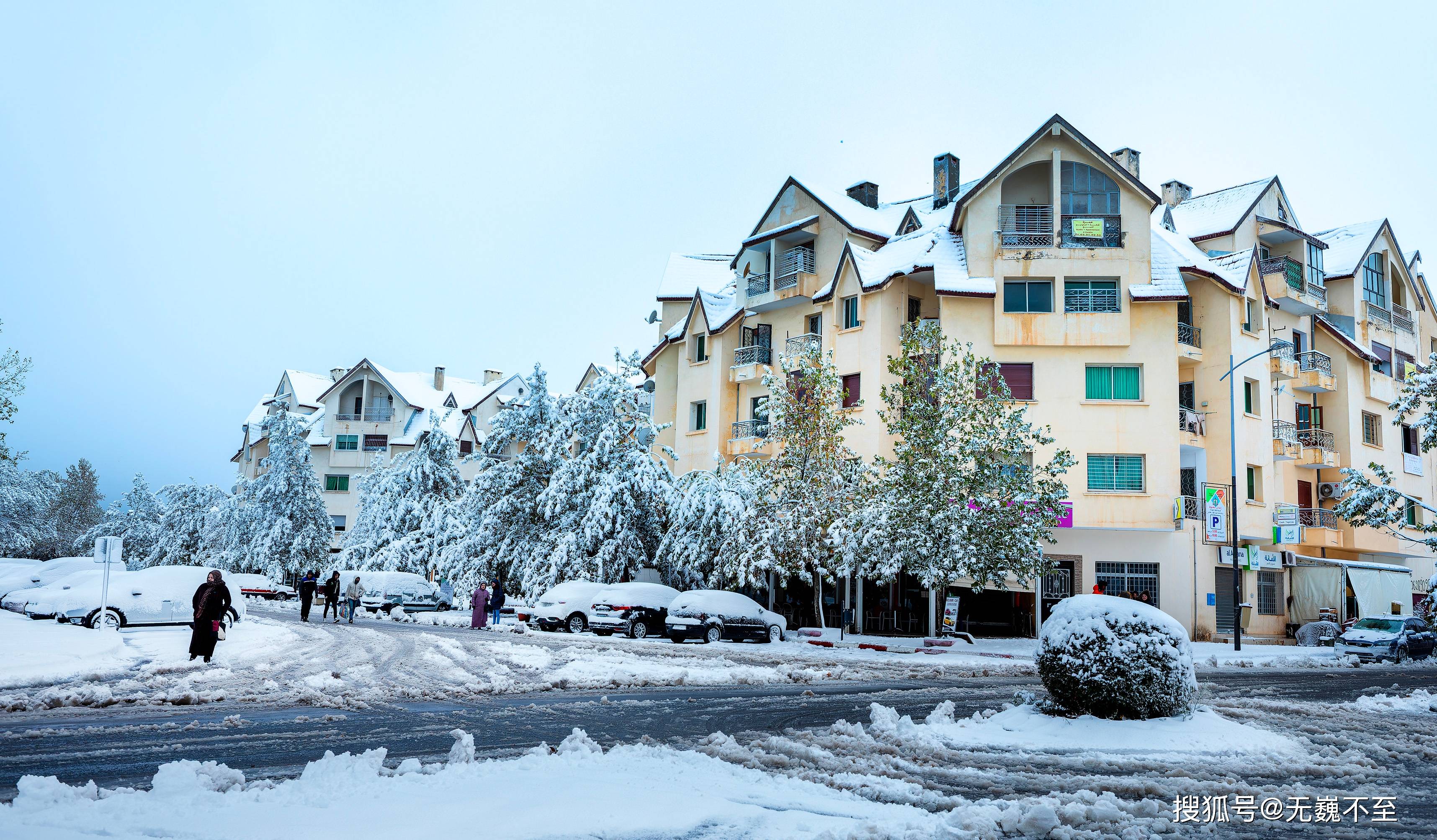伊芙兰的地中海式建筑在雪中展现出别样风韵。红瓦屋顶渐渐被白色覆盖,只偶尔在屋檐处露出一抹暖色,像是羞怯的提醒:这里终究是阳光眷顾的北非。树下的长椅积了厚厚的雪,偶尔有不怕冷的情侣匆匆走过,留下两行并行的脚印,旋即又被新雪掩去痕迹。