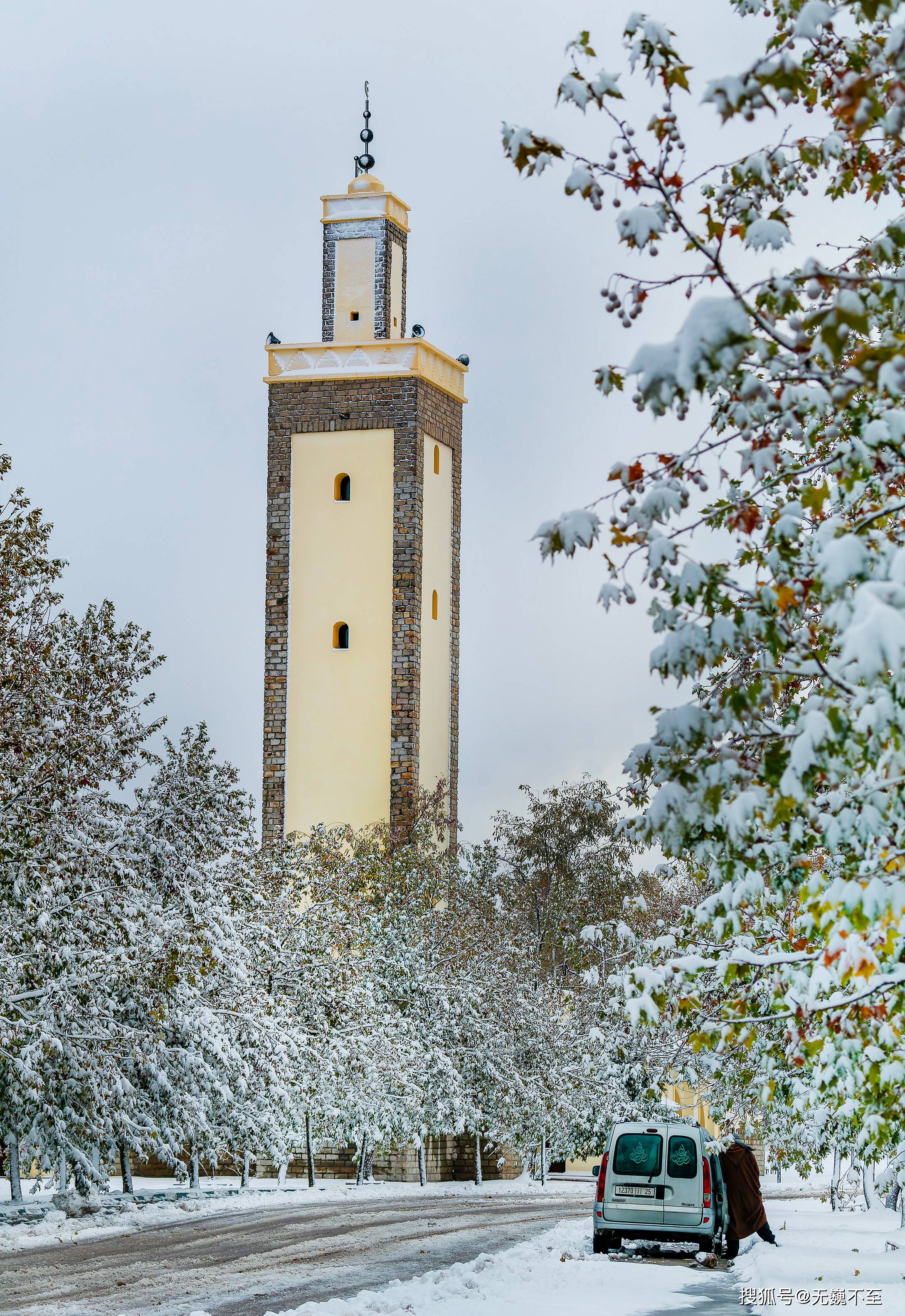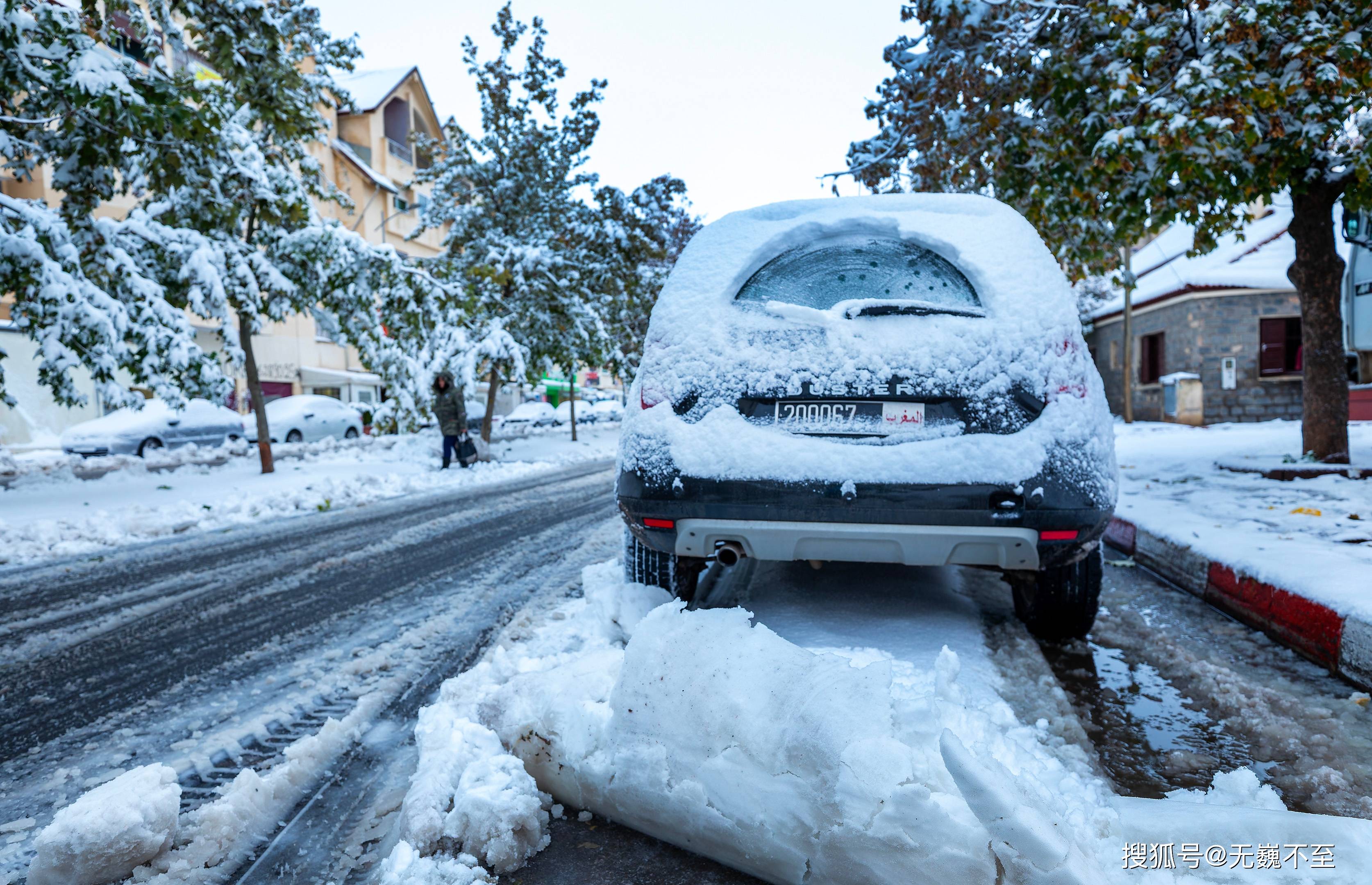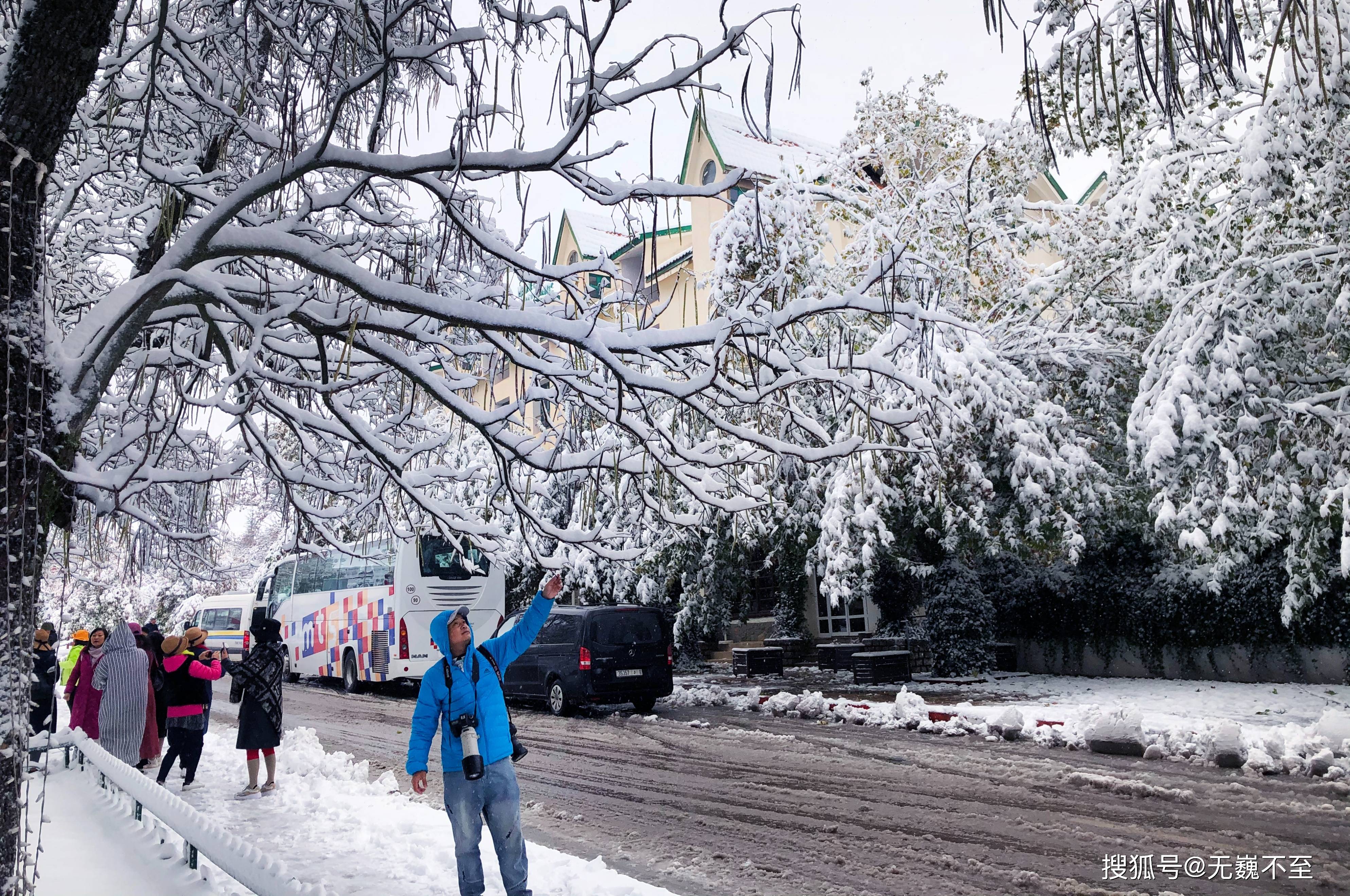 伊芙兰的地中海式建筑在雪中展现出别样风韵。红瓦屋顶渐渐被白色覆盖,只偶尔在屋檐处露出一抹暖色,像是羞怯的提醒:这里终究是阳光眷顾的北非。树下的长椅积了厚厚的雪,偶尔有不怕冷的情侣匆匆走过,留下两行并行的脚印,旋即又被新雪掩去痕迹。