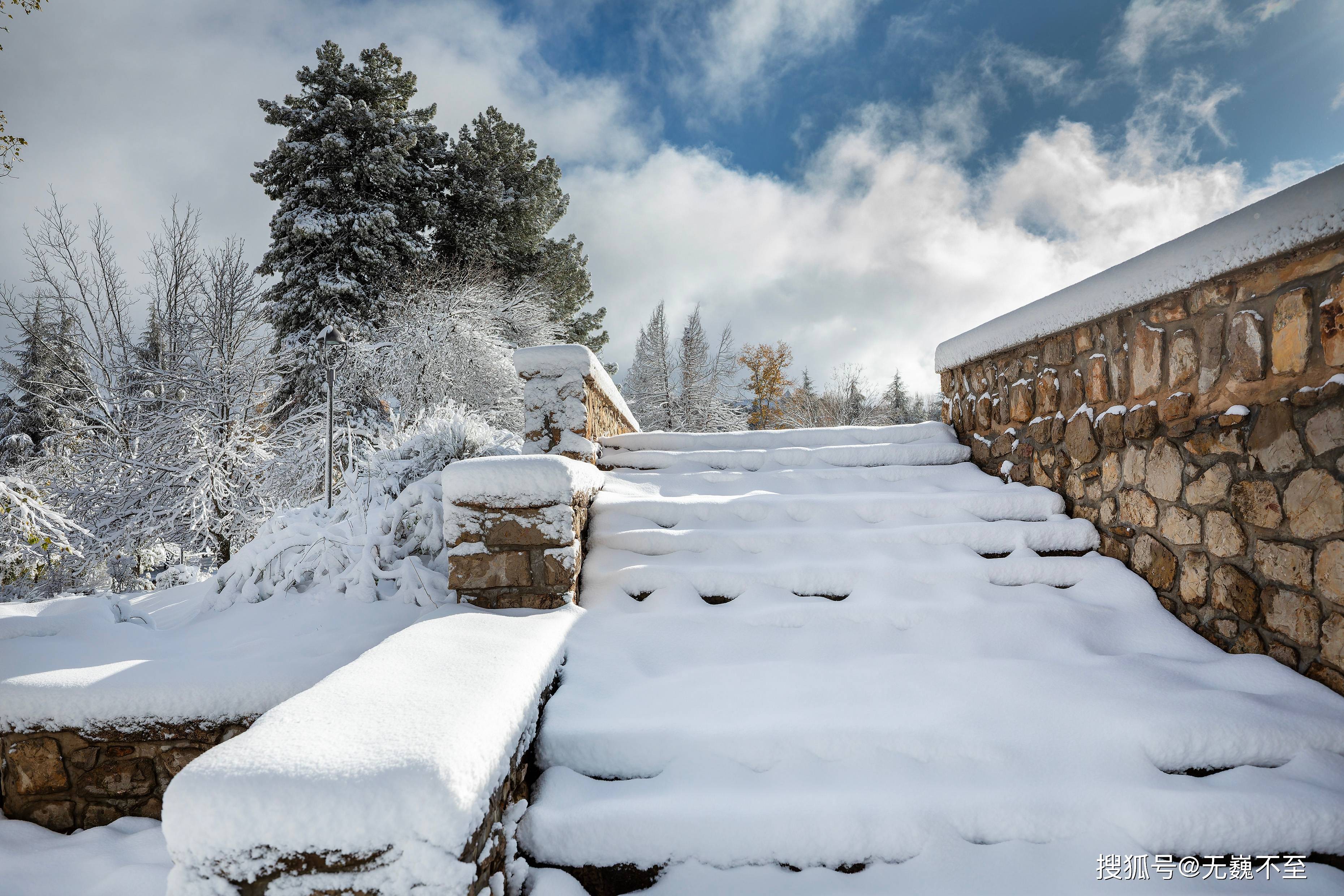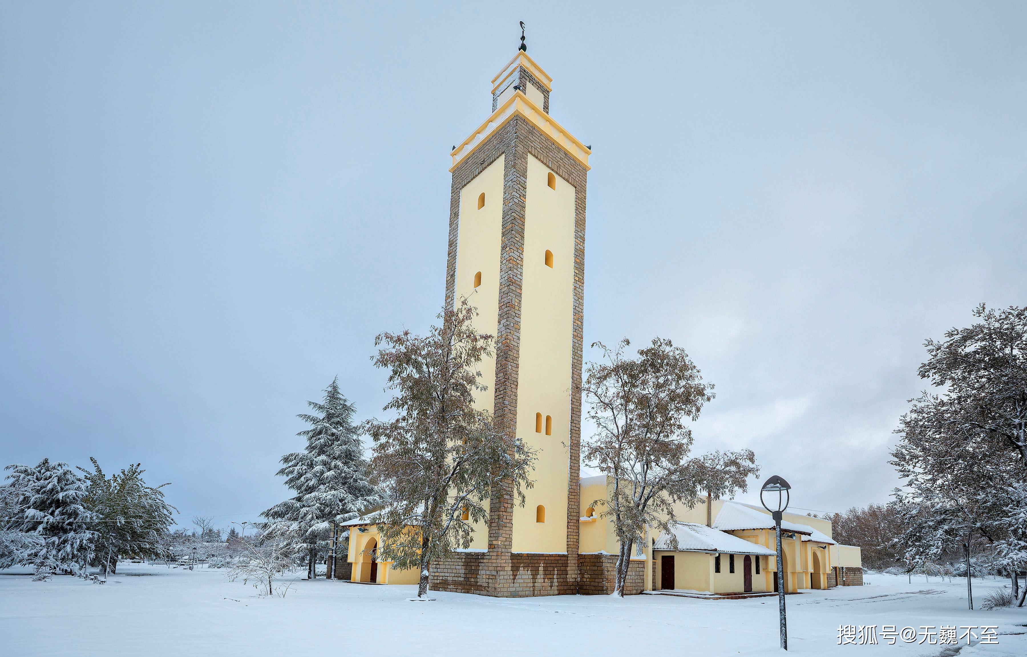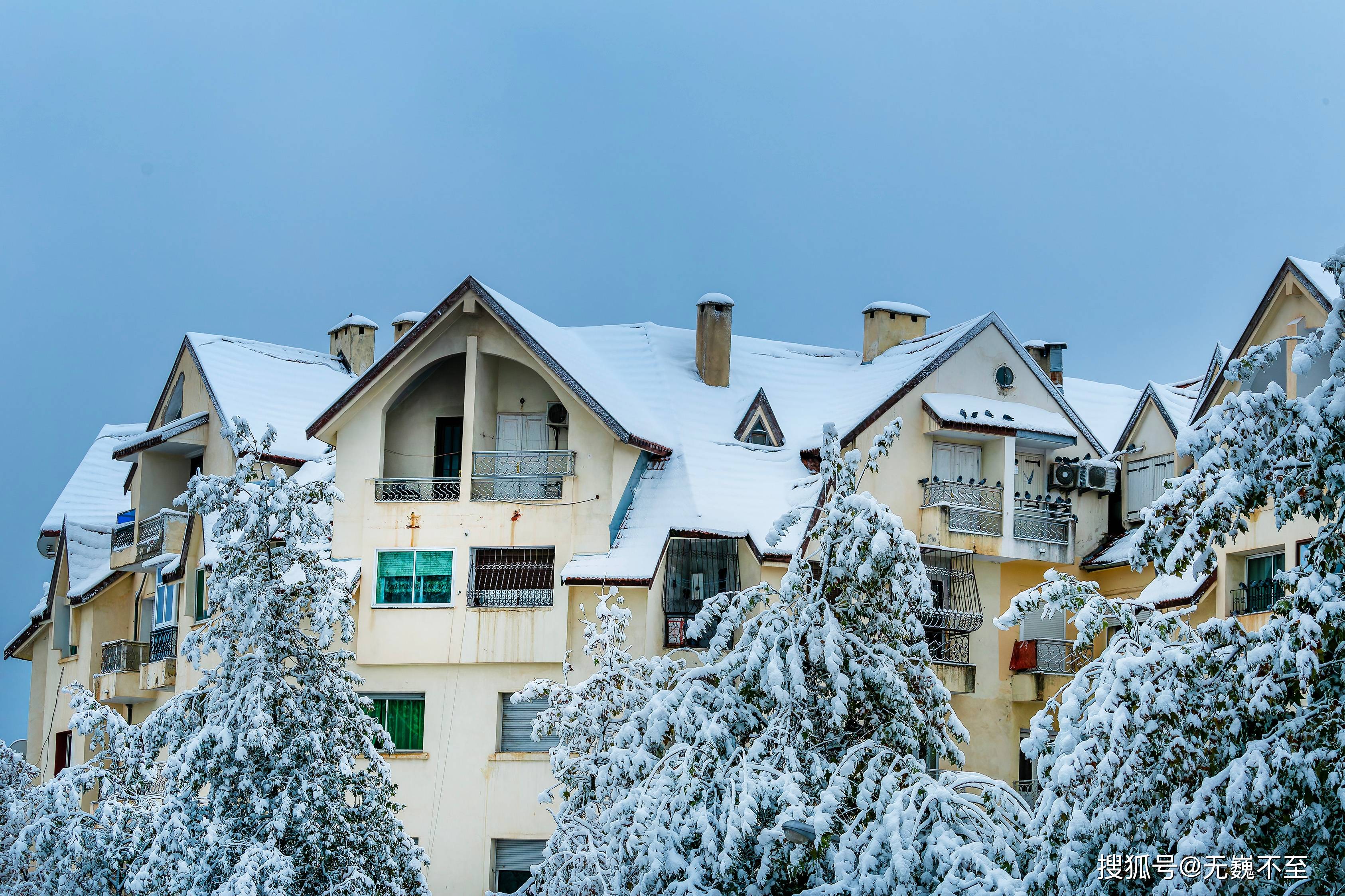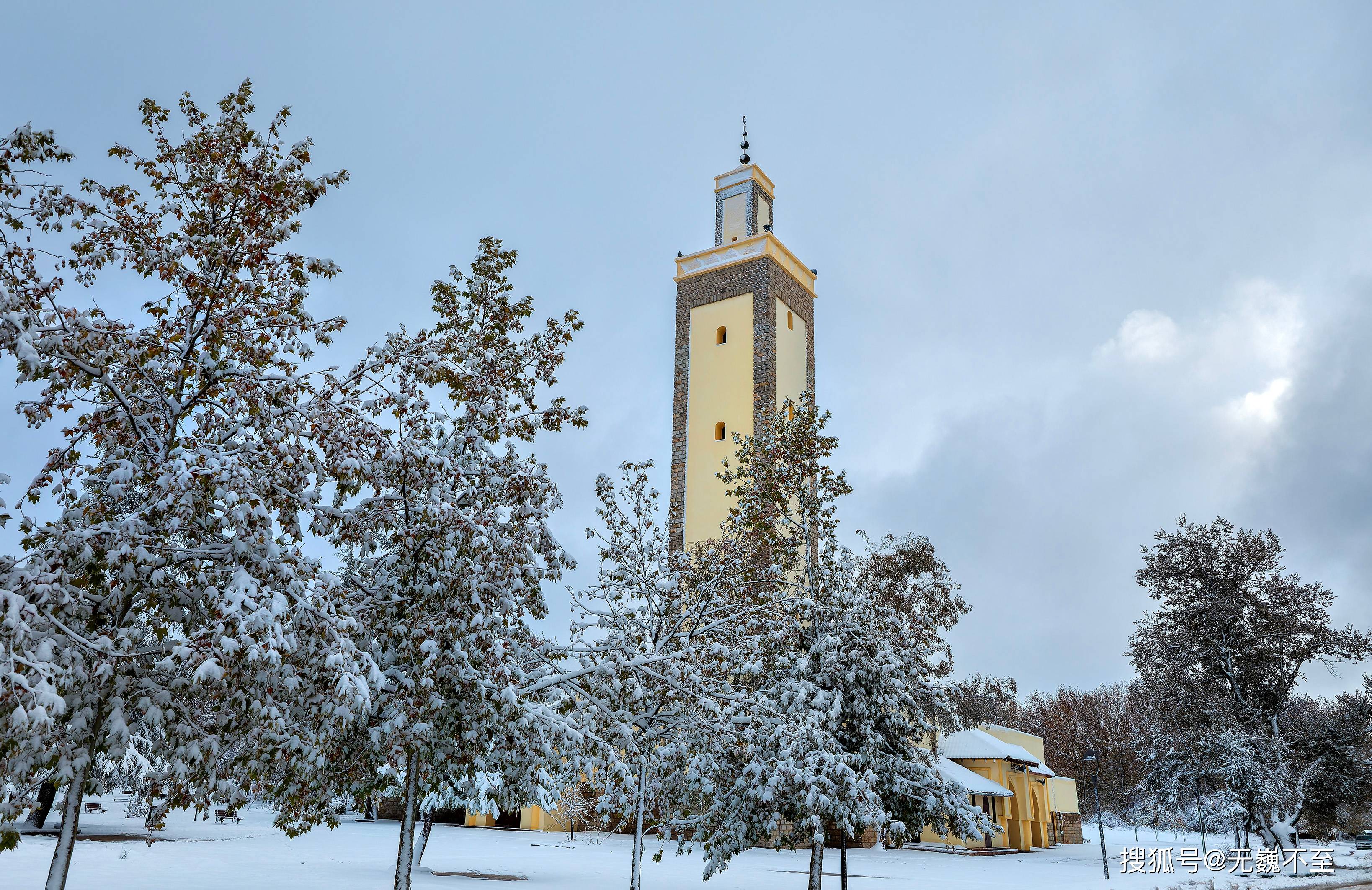 伊芙兰的地中海式建筑在雪中展现出别样风韵。红瓦屋顶渐渐被白色覆盖,只偶尔在屋檐处露出一抹暖色,像是羞怯的提醒:这里终究是阳光眷顾的北非。树下的长椅积了厚厚的雪,偶尔有不怕冷的情侣匆匆走过,留下两行并行的脚印,旋即又被新雪掩去痕迹。