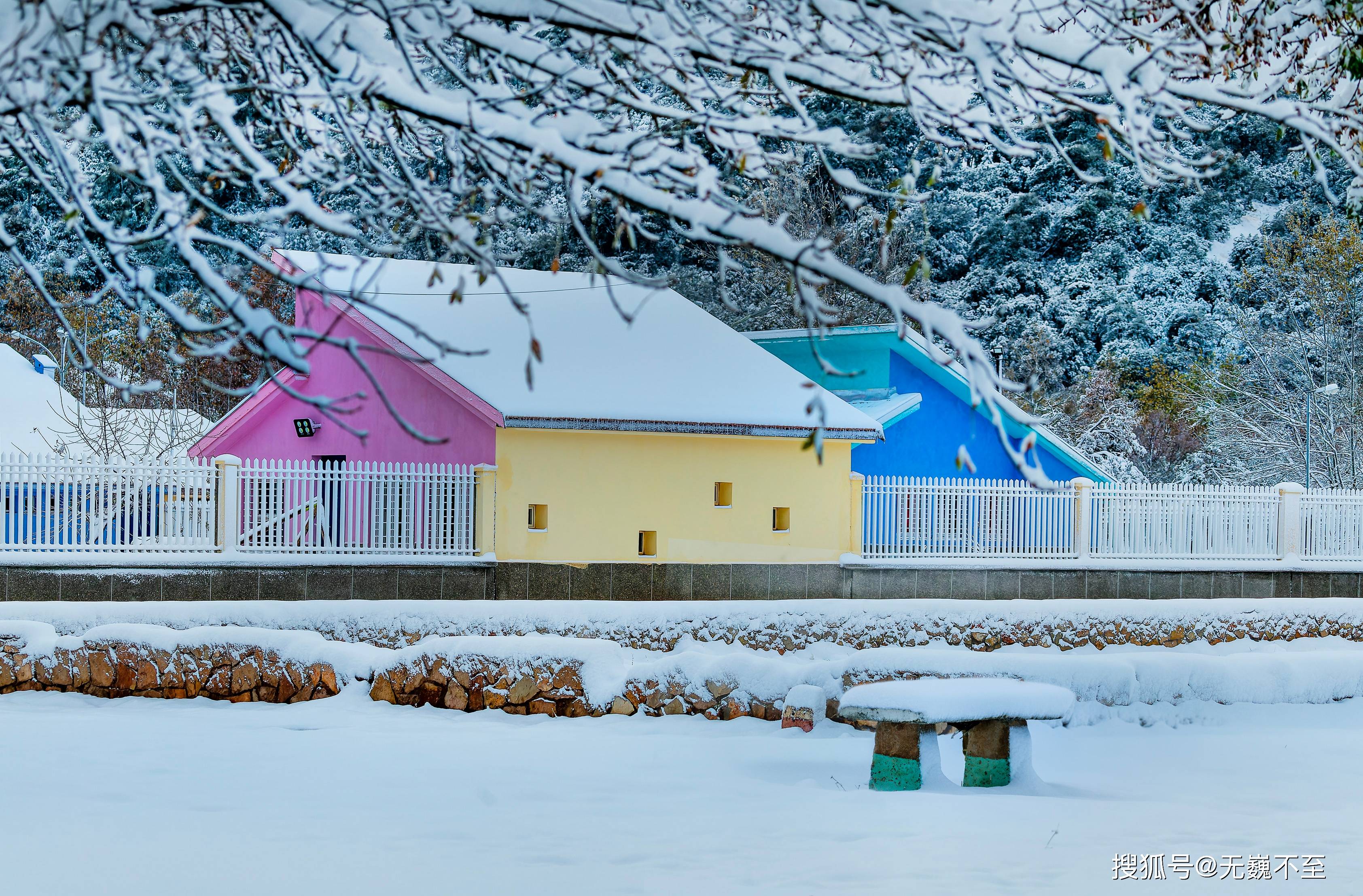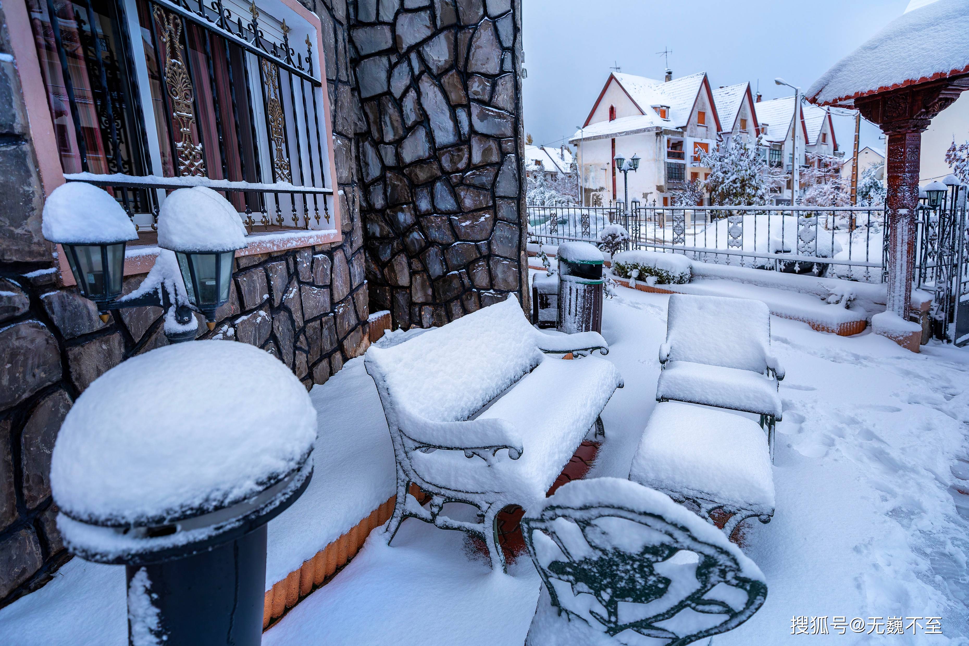 庭院中的镂花桌椅和宫廷式壁灯,堆着松松软软的白雪,如同裹满奶油淋上糖霜的蛋糕和冰淇淋——七个小矮人和白雪公主的晚宴是在这举办的么?