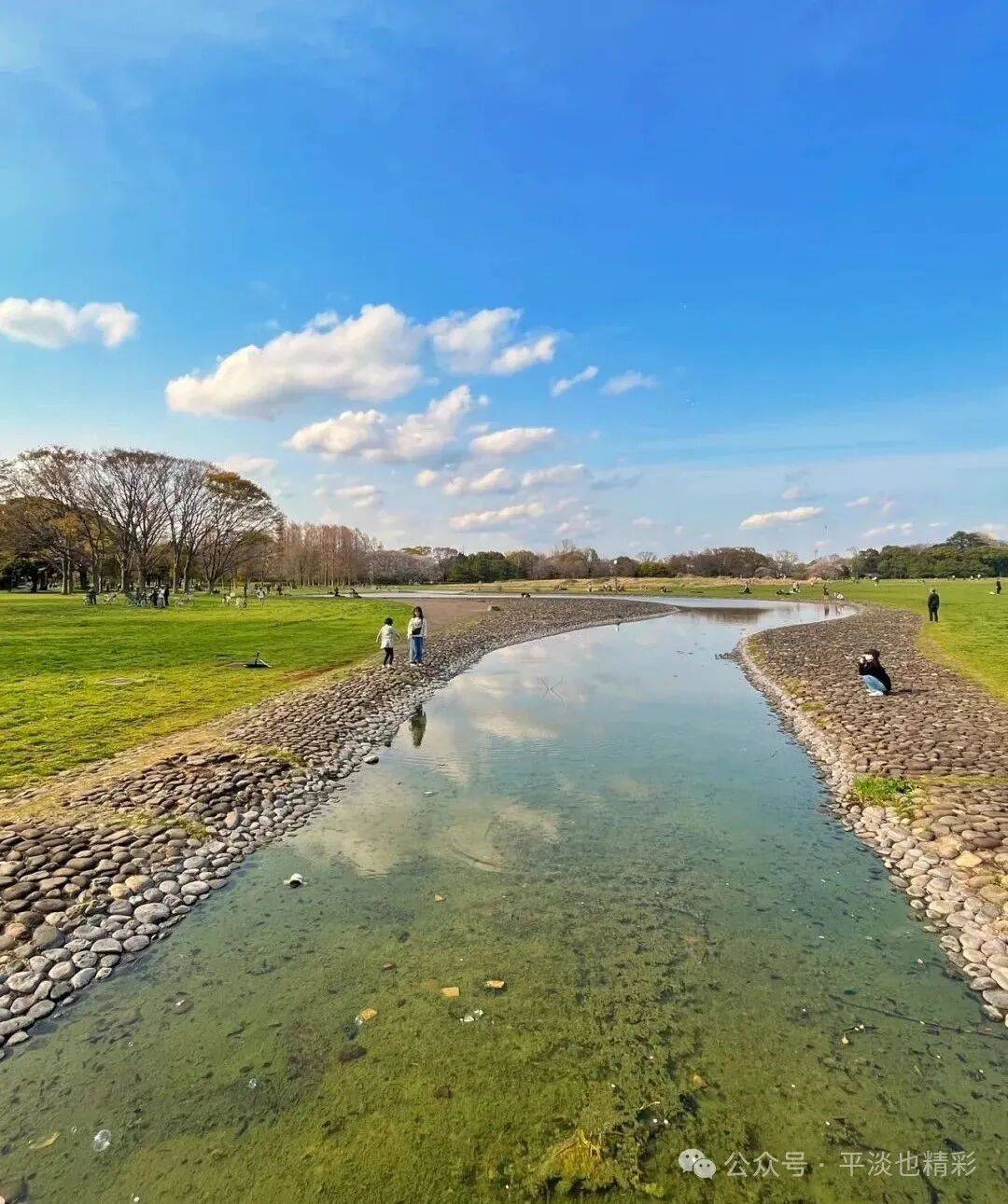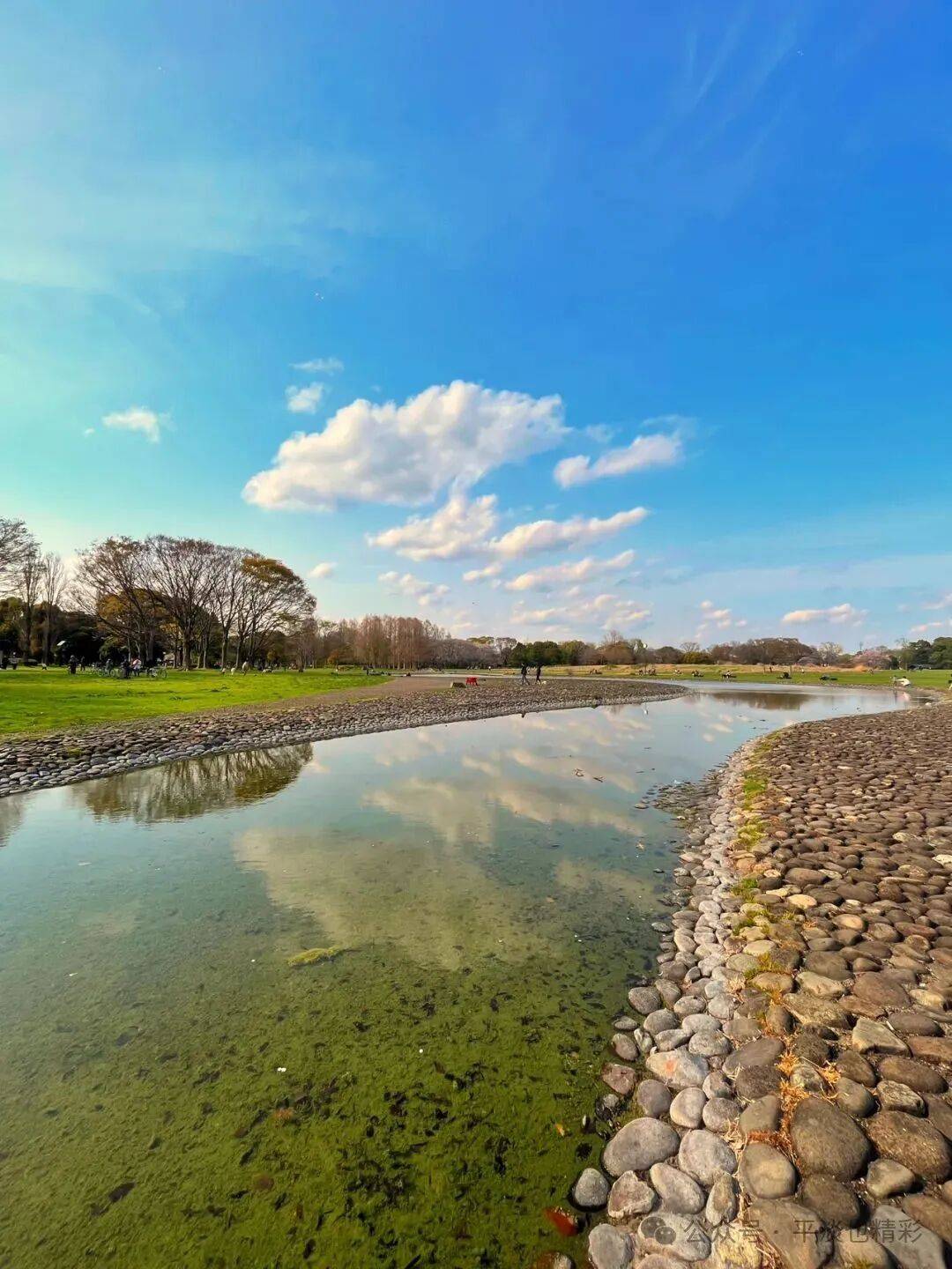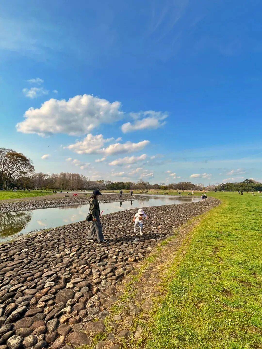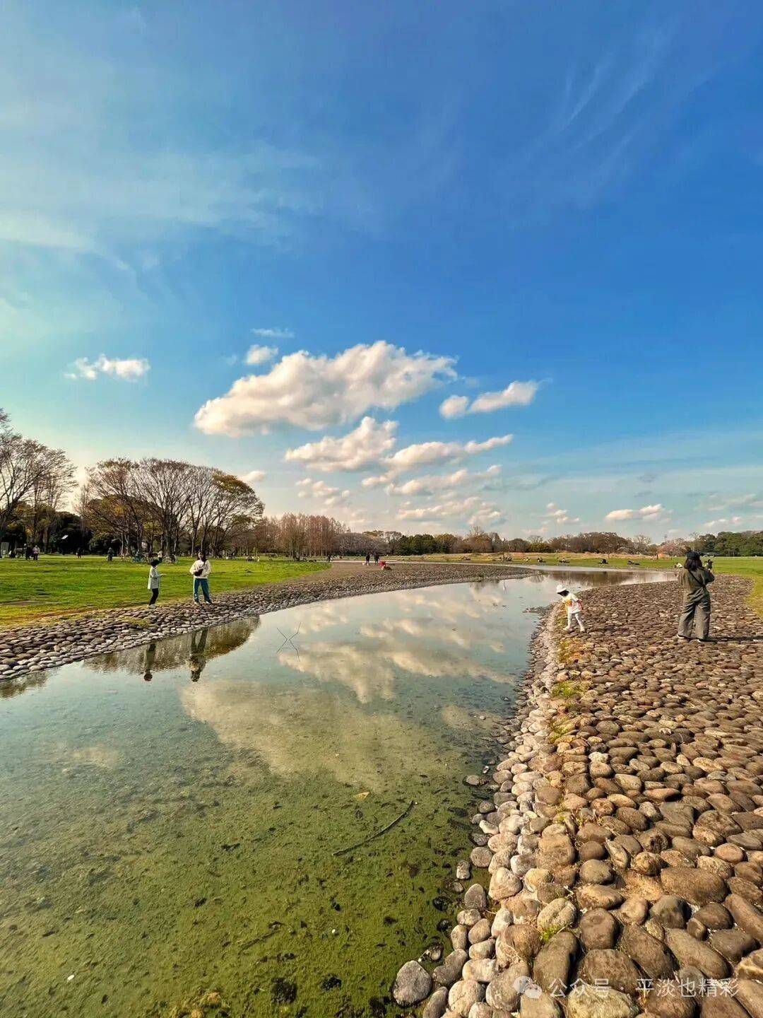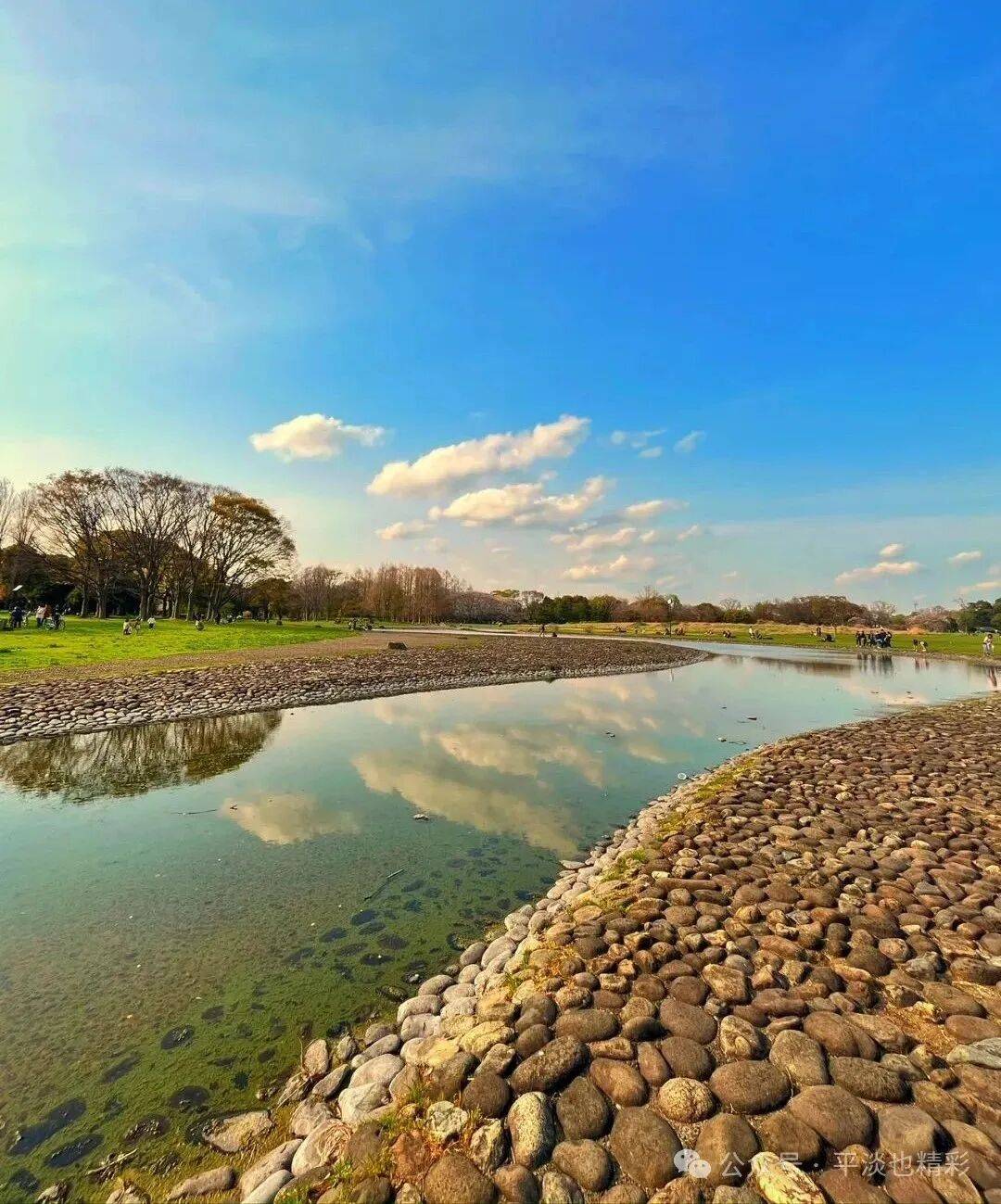 再次来到小河边,河水比上次少了许多,河面更窄小了。蓝天白云下,河水浅浅、弯弯绵延;游人玩耍,嬉戏河边;此情此景,如诗如画,比上次来的时候还美。此时水面平静如镜,选到了合适的角度,还拍到了几张水中倒影,天水相映成趣、人与自然和谐,别有一番意境。