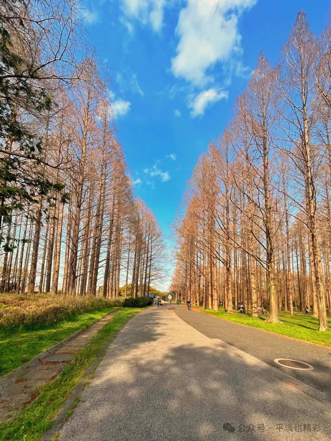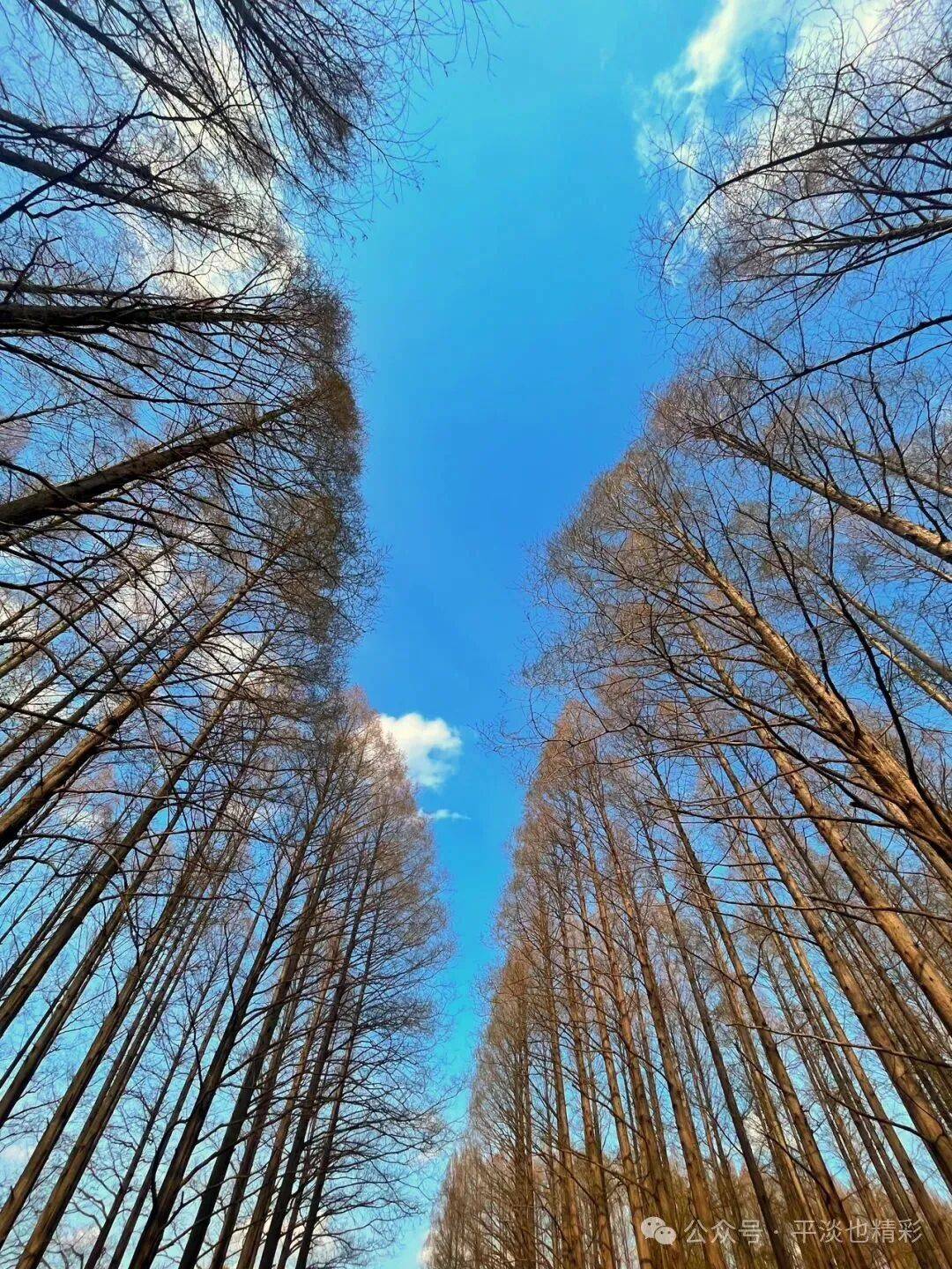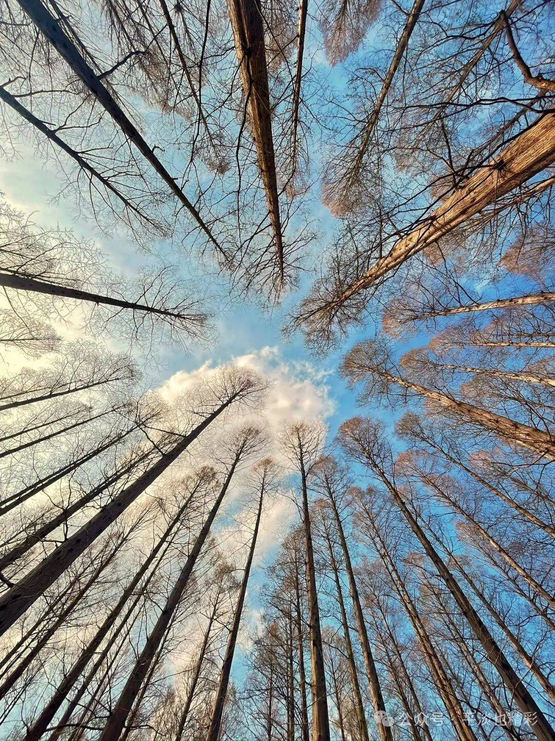 这次来公园,比上次提前了24天,此时的公园里,有的树木刚吐露新绿、草坪上的小草幼嫩浅绿,一派生机盎然的景象让人心旷神怡。这个时节的水杉树,还没长出新叶,树干更显挺拔俊秀;树枝繁盛细密、疏密有致;即使细枝末节,也是密中有隙;在蓝天白云的映衬下,显得格外清晰而富有层次感;自上而下同属一色---土褐色;水杉林看上去就像被统一刷染过一样,色调一致,干净整齐;宛如一幅天然的彩色素描,自成了一道风格独特的风景线。