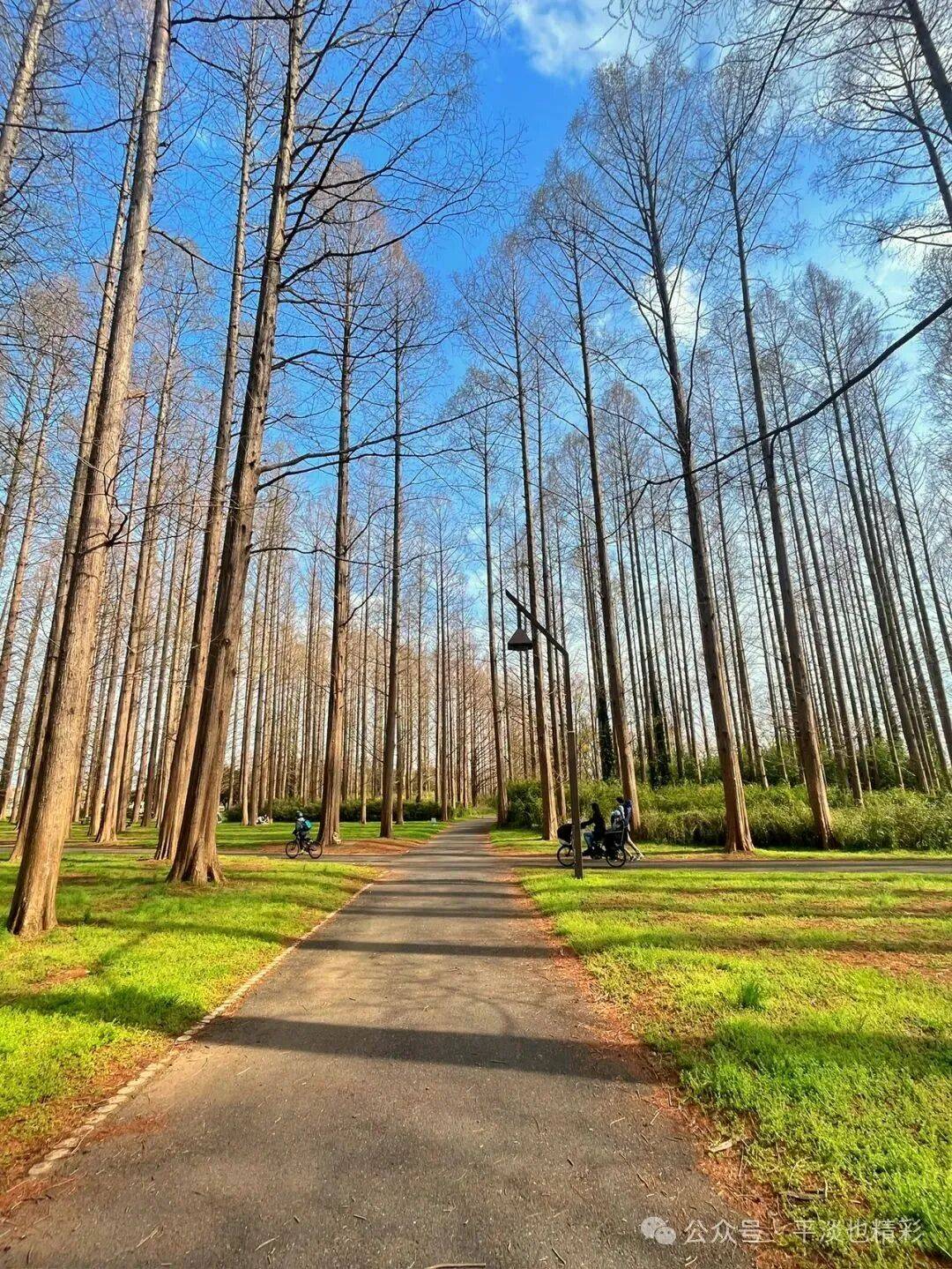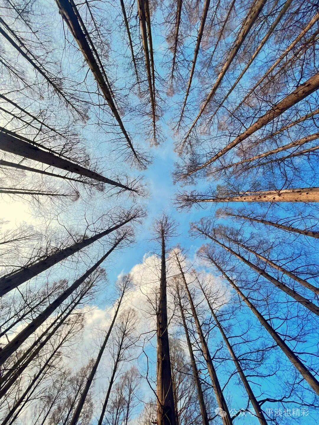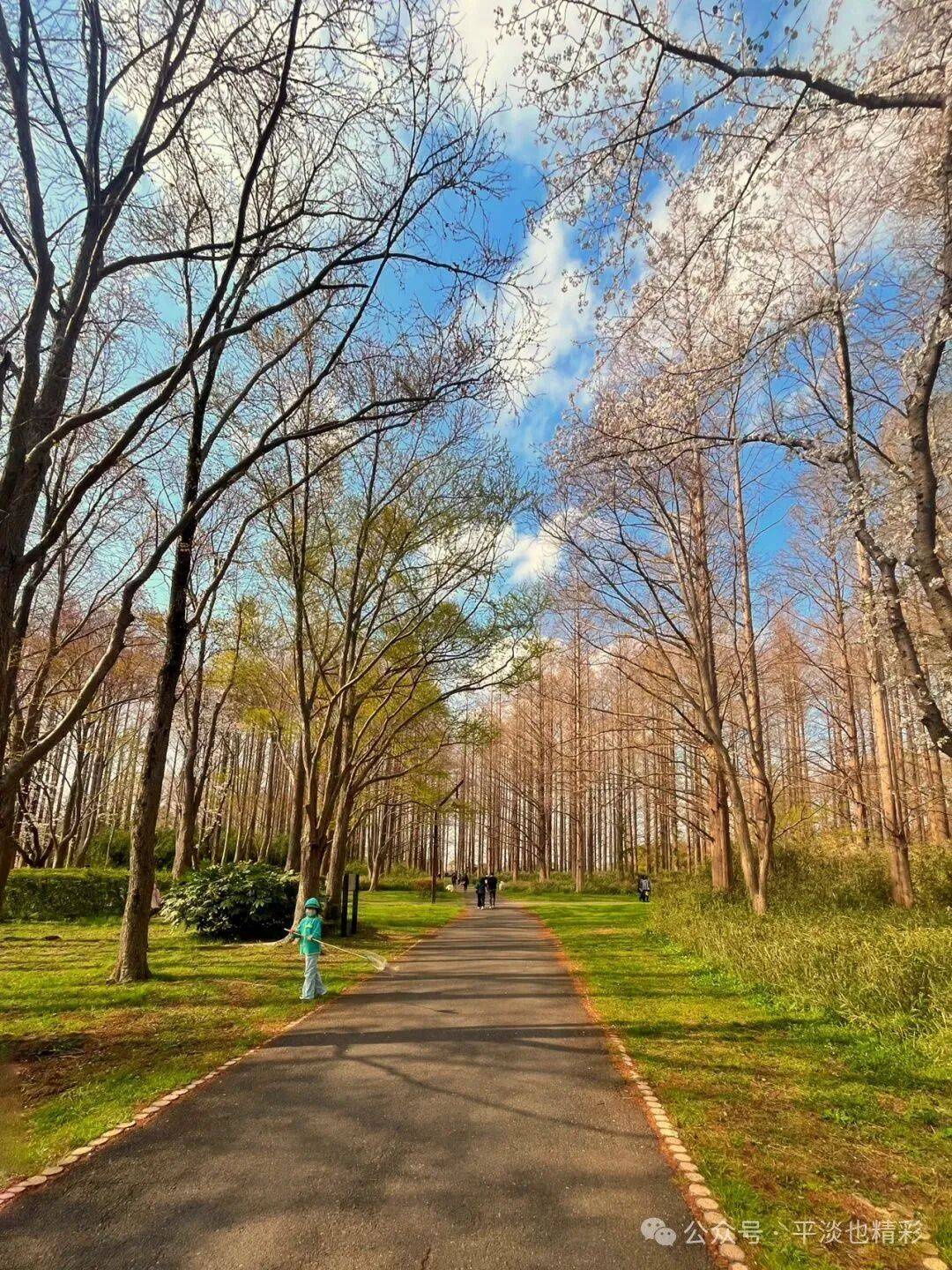 这次来公园,比上次提前了24天,此时的公园里,有的树木刚吐露新绿、草坪上的小草幼嫩浅绿,一派生机盎然的景象让人心旷神怡。这个时节的水杉树,还没长出新叶,树干更显挺拔俊秀;树枝繁盛细密、疏密有致;即使细枝末节,也是密中有隙;在蓝天白云的映衬下,显得格外清晰而富有层次感;自上而下同属一色---土褐色;水杉林看上去就像被统一刷染过一样,色调一致,干净整齐;宛如一幅天然的彩色素描,自成了一道风格独特的风景线。