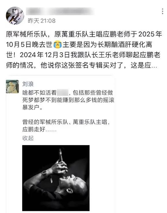 10月6日中秋团圆之夜,摇滚圈传来一则噩耗,摇滚歌手应鹏因病去世,年仅43岁,其多位好友发文,证实应鹏已于10月5日去世,走得特别突然。