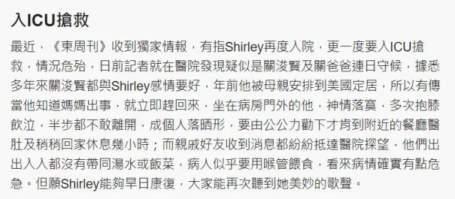 港媒报道,消失多年的乐坛天后关淑怡(Shirley),突然入院,更一度被送进ICU抢救,情况令人担忧。