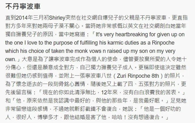 直到2014年,关淑怡突然在社交网爆料,称儿子的父亲是不丹活佛,并公布男方照片。