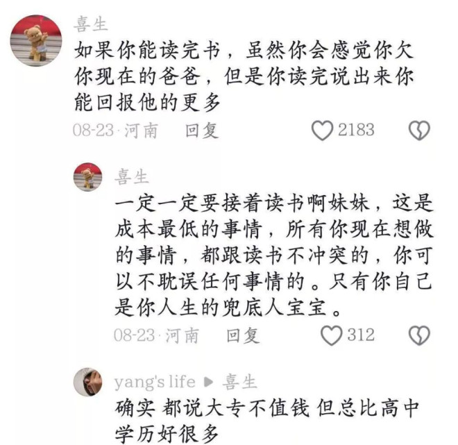 有网友建议她别放弃学业,能上大专的话就去学习,毕竟有个学历还是挺有用的。