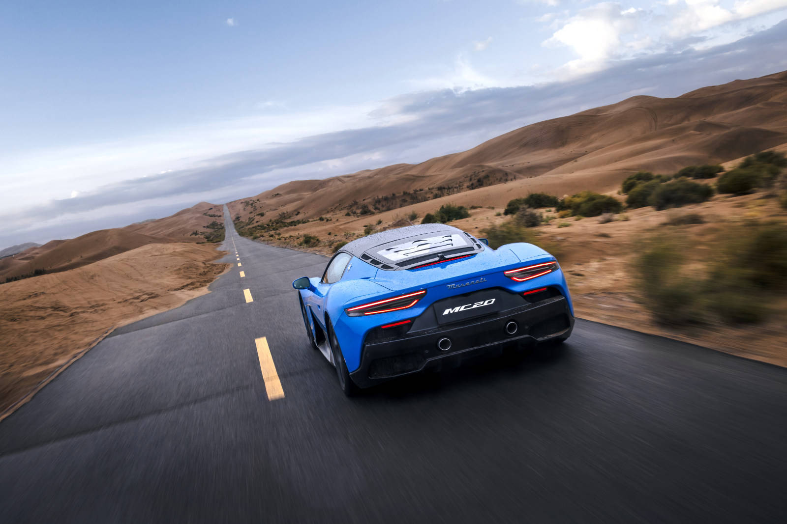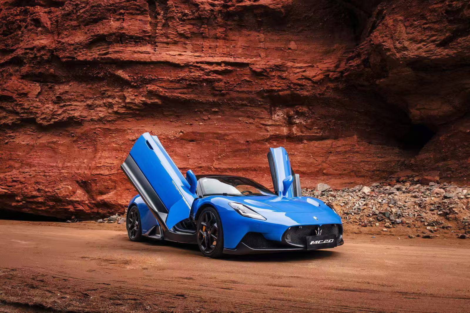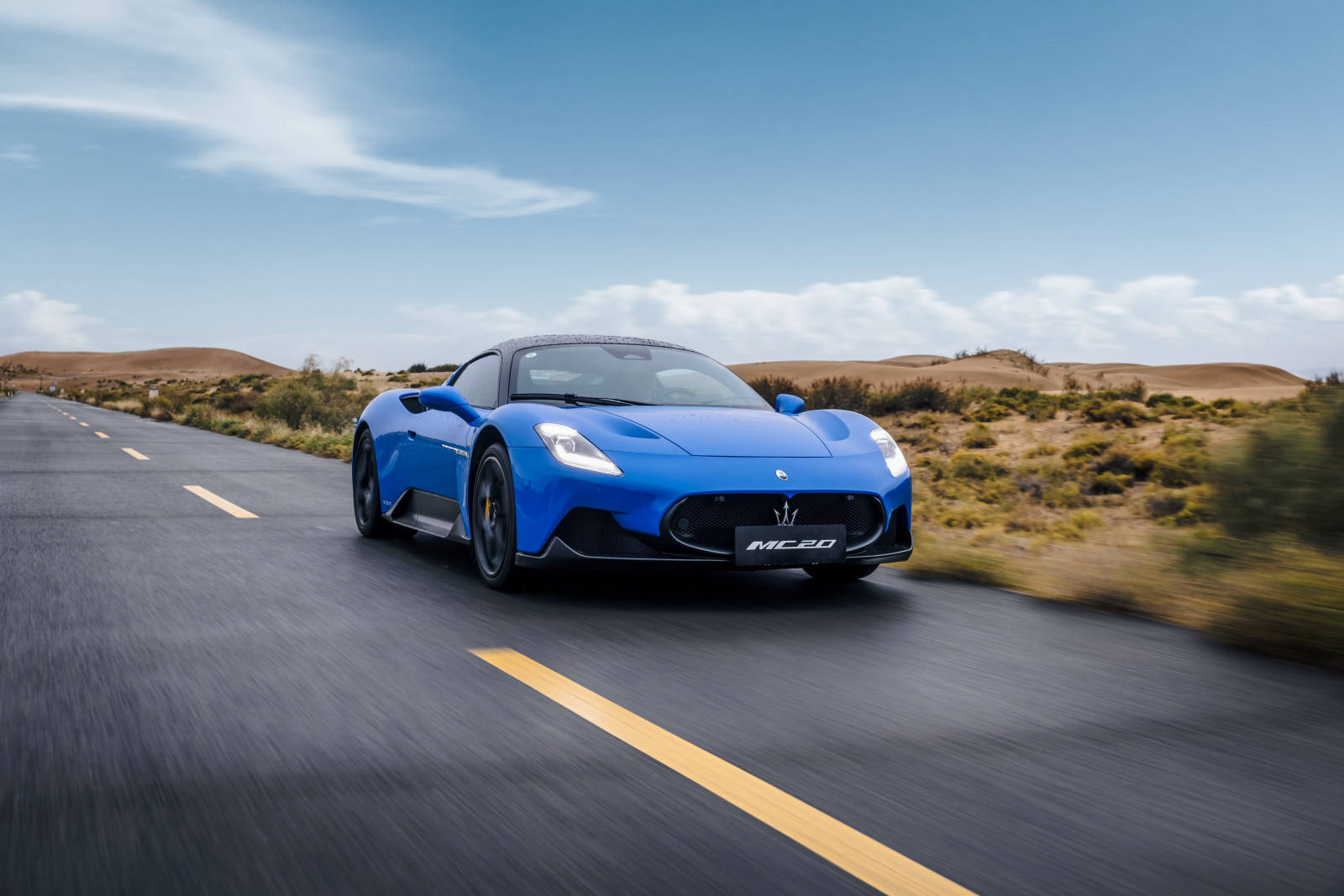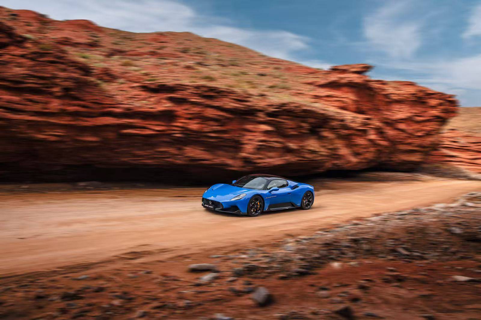在穿沙公路上,MC20的一抹蓝色像光一样划过。外观设计融合了品牌特色和空气动力学创新,造型很独特。