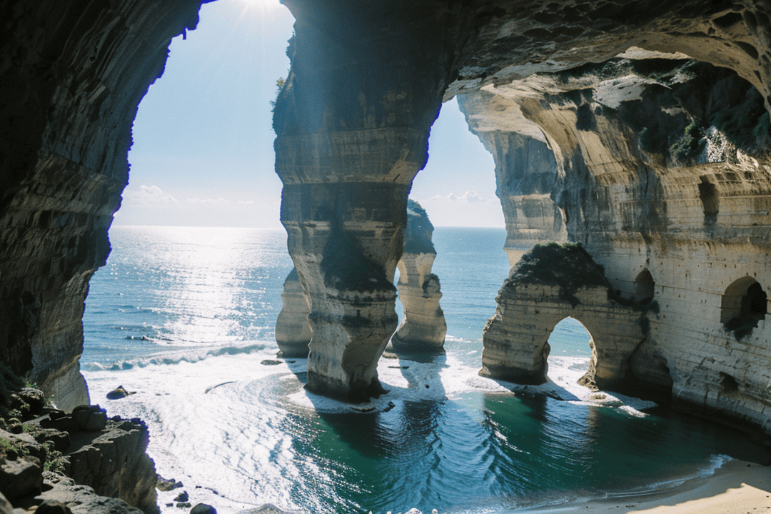 沿着石阶走下去,能看到一处微型港湾,几艘小船静静停泊在碧蓝的海水里。船夫戴着草帽,轻轻一划桨,便带游客进入那些被海浪掏空的洞穴。阳光从岩缝间洒下,一束束光柱落在水面上,反射出粼粼碎银。海水呈现出三层颜色——近岸处是浅绿,洞中深处是幽蓝,而最远的海心,则是一种深不可测的墨蓝,仿佛通向世界的尽头。