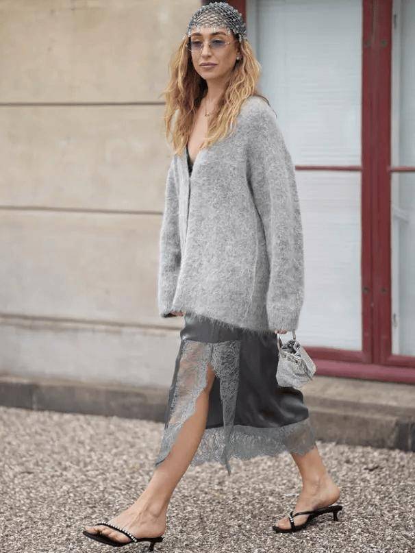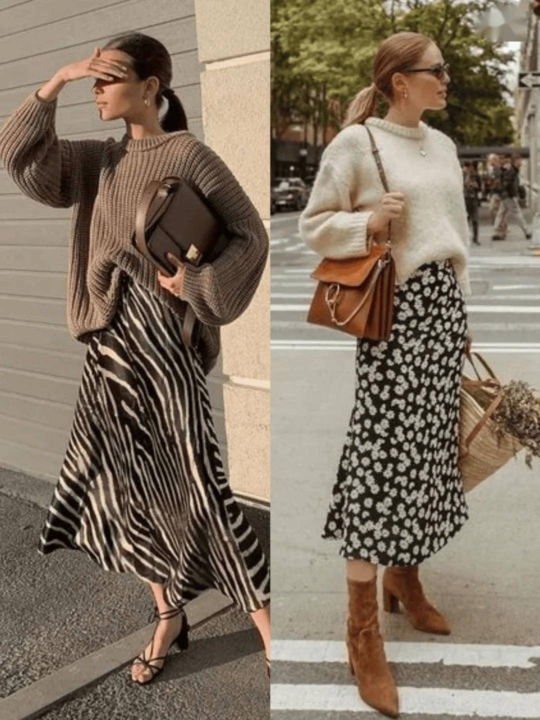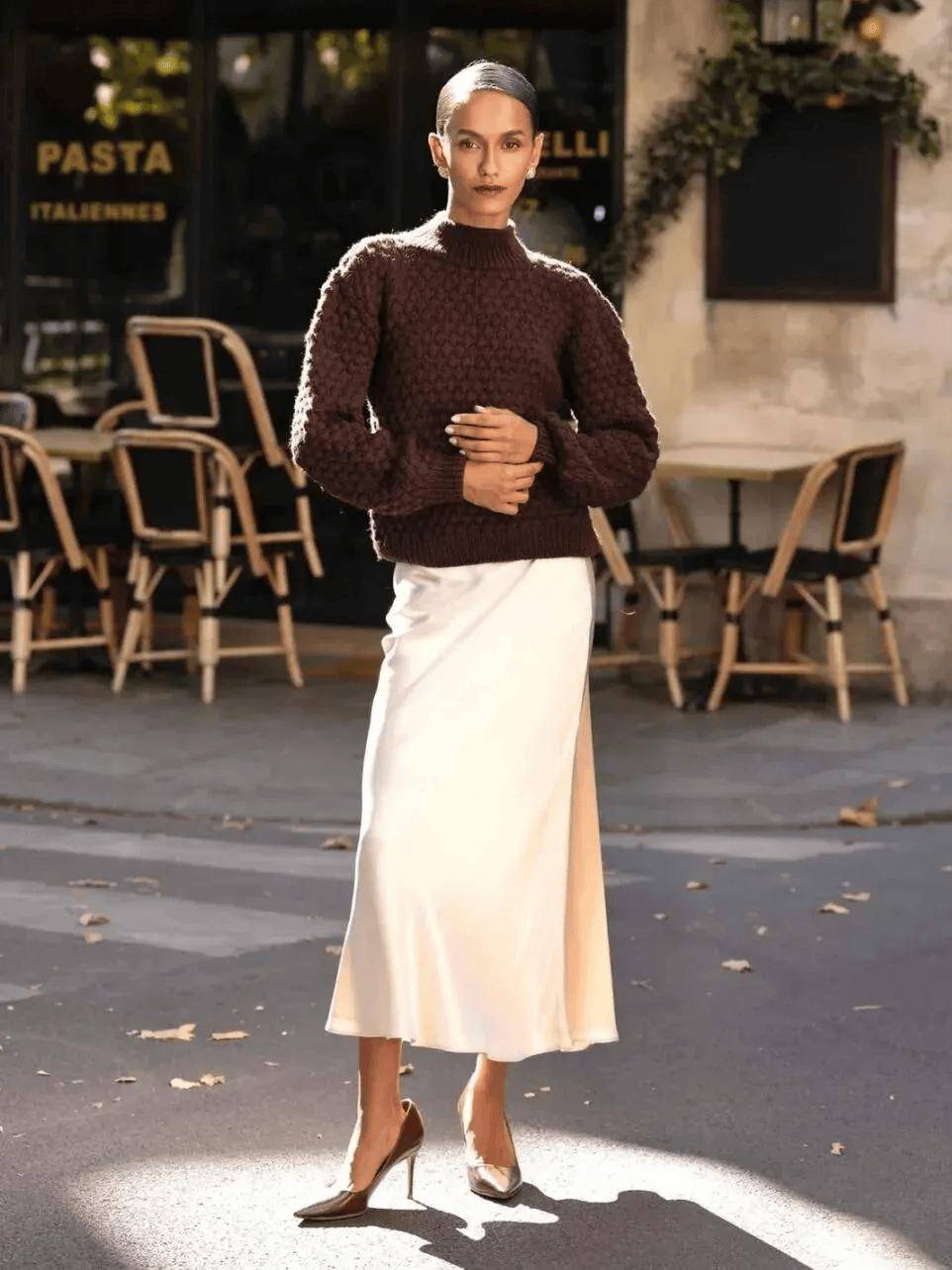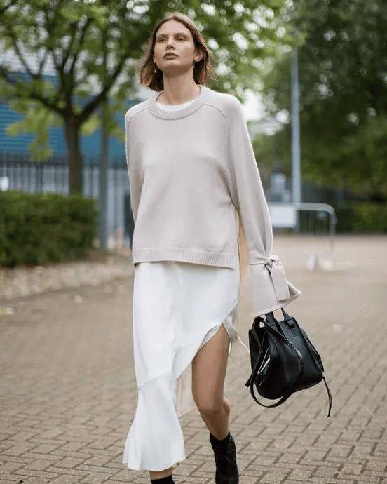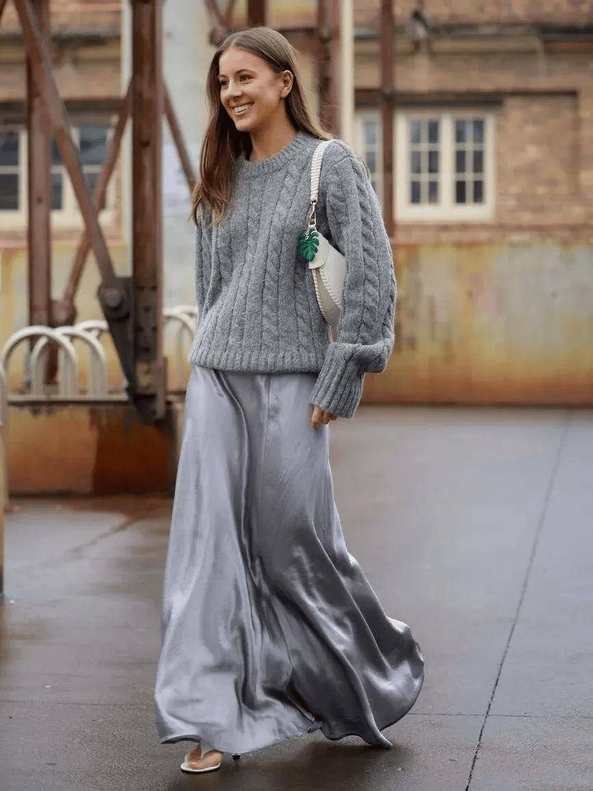 穿搭公式:宽松毛衣 + 缎面/丝绸/针织长裙。