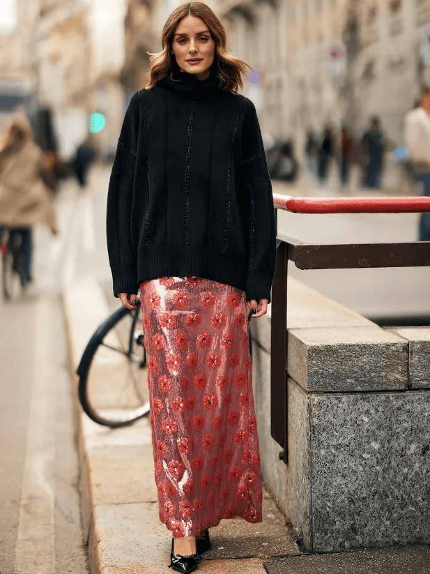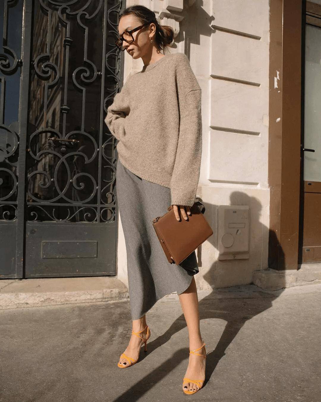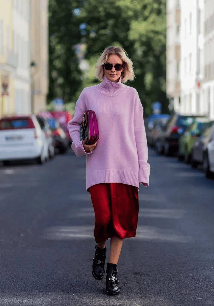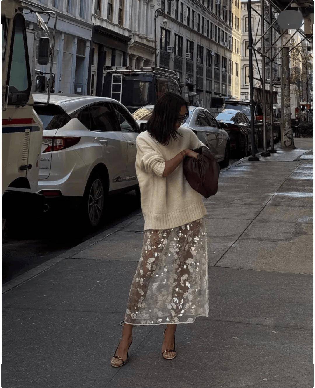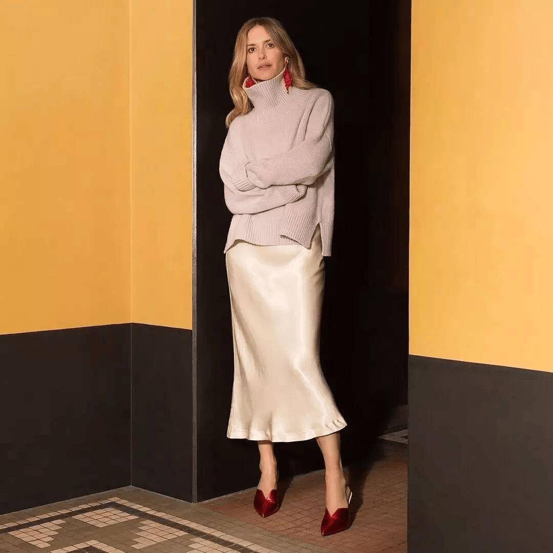 穿搭公式:宽松毛衣 + 缎面/丝绸/针织长裙。