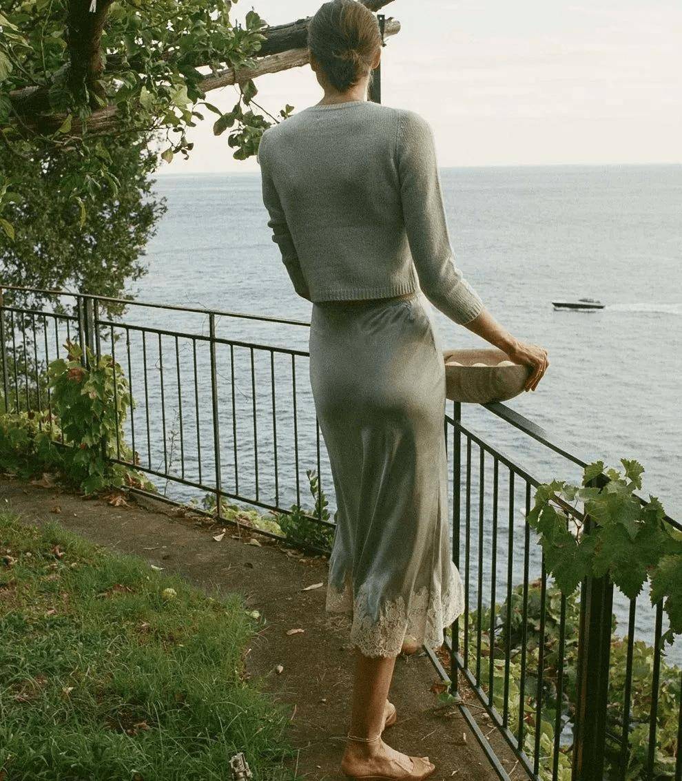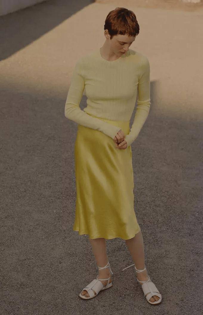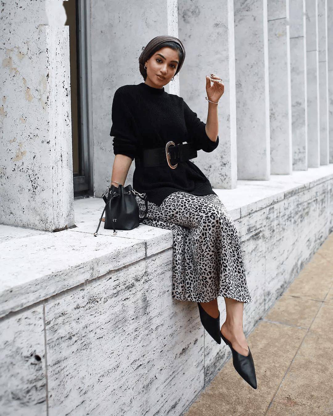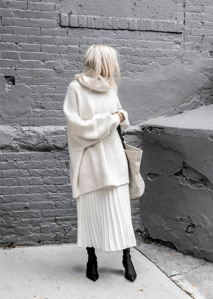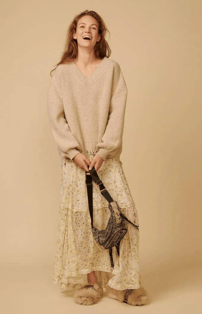 穿搭公式:宽松毛衣 + 缎面/丝绸/针织长裙。