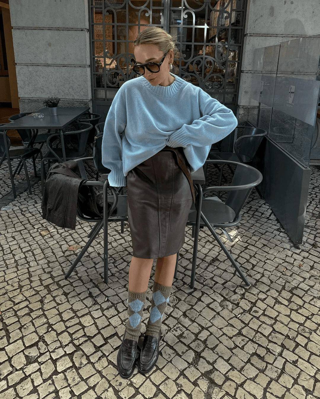 蓝色毛衣搭配棕色皮裙,尤其是浅蓝色毛衣,清爽又衬肤色,营造出温柔浪漫的氛围。