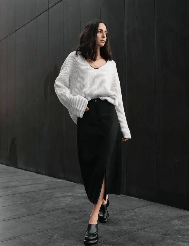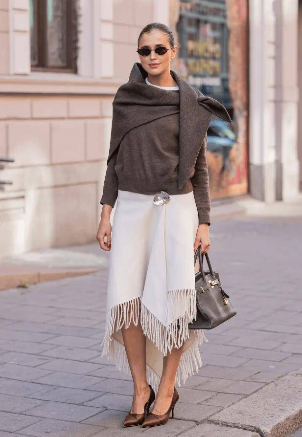 穿搭公式:基础款毛衣 + 斜裁/层叠/不对称半裙。