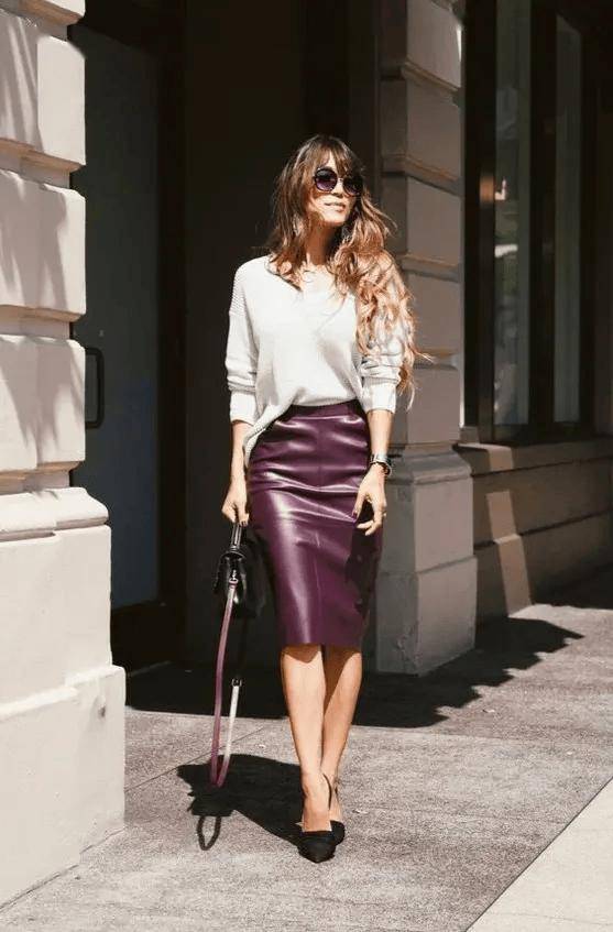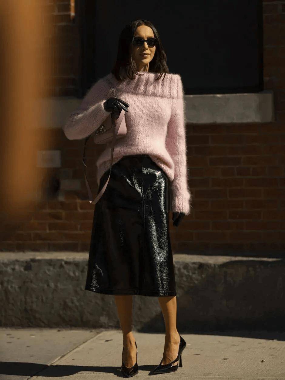 穿搭公式:修身毛衣 + 西装裙/皮革裙/伞裙。